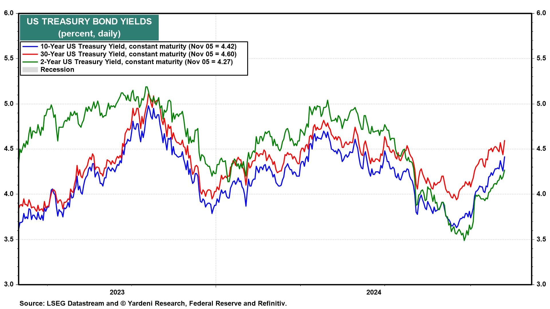 Treasury yields jumped as the yield curve steepened. The Bond Vigilantes are pricing in higher growth, inflation, and government borrowing. The 10-year yield rose 15bps to around 4.40% and the 30-year yield rose 18bps to roughly 4.60% today (chart).