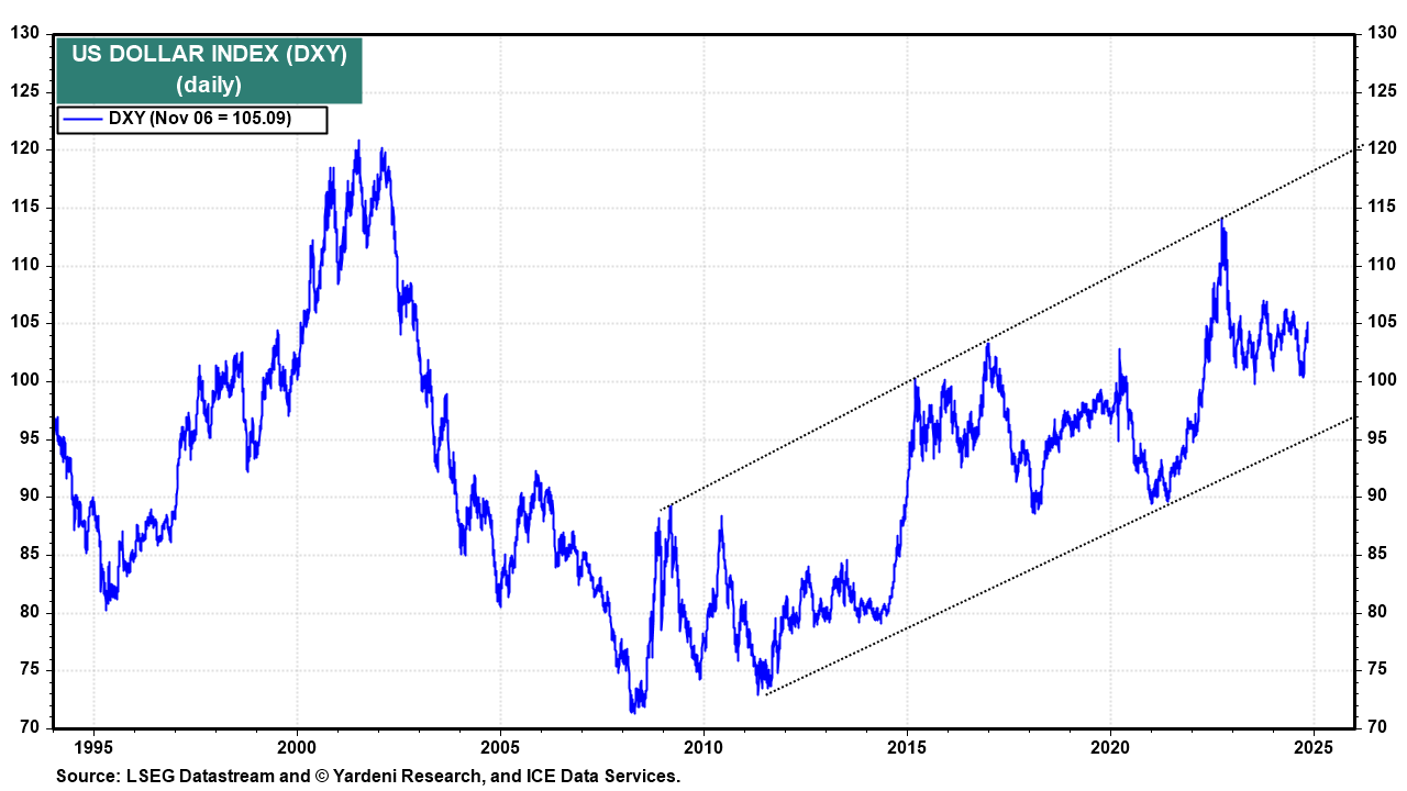 For now, we're also sticking with our subjective probabilities for the following three scenarios: Roaring 2020s (50%), 1990s-style stock market meltup (20%), and 1970s-style geopolitical crisis with a possible US debt crisis (30%). But we are considering raising the odds of the Roaring 2020s scenario as a looser regulatory environment and lower corporate and income taxes under Trump 2.0 should boost investment and propel productivity-led economic growth.