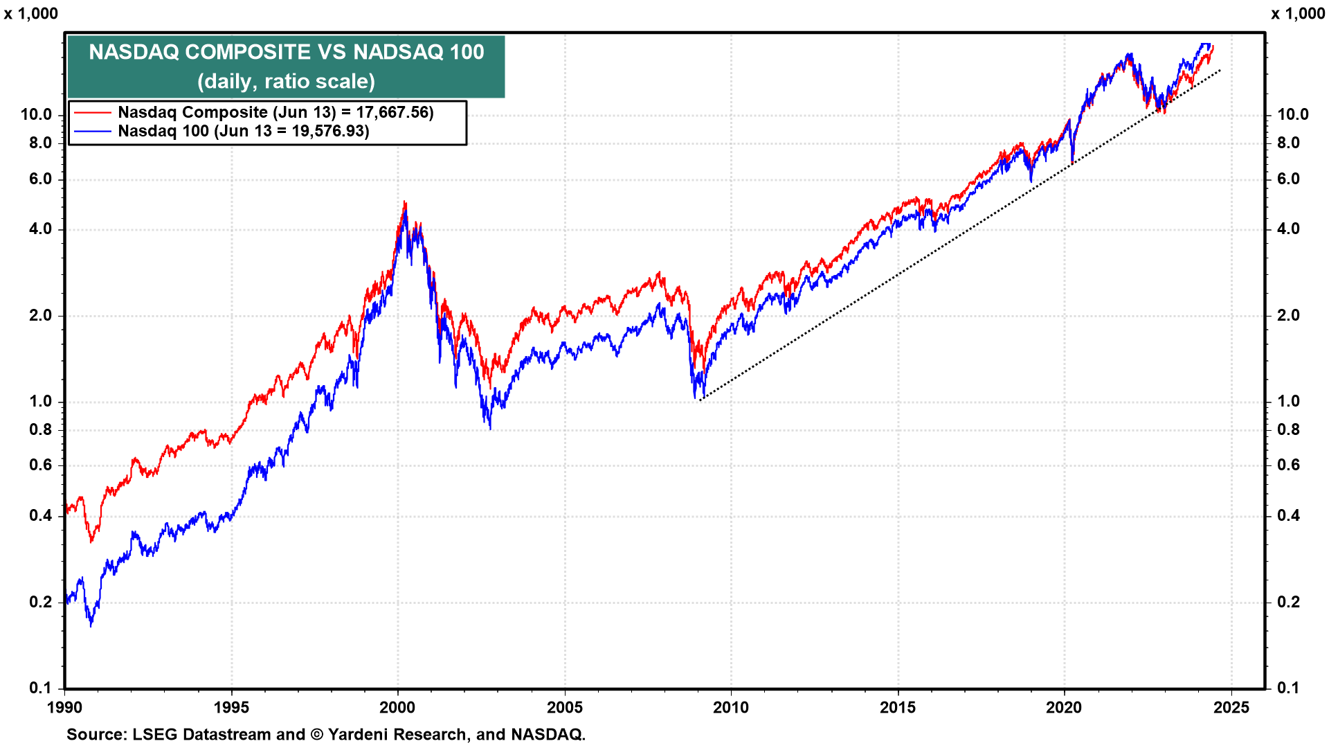 The Nasdaq hit another record high today (chart). Leading the way to new highs is Apple. The company introduced Apple Intelligence at its Worldwide Developers Conference this week. Siri has been supercharged with ChatGPT.