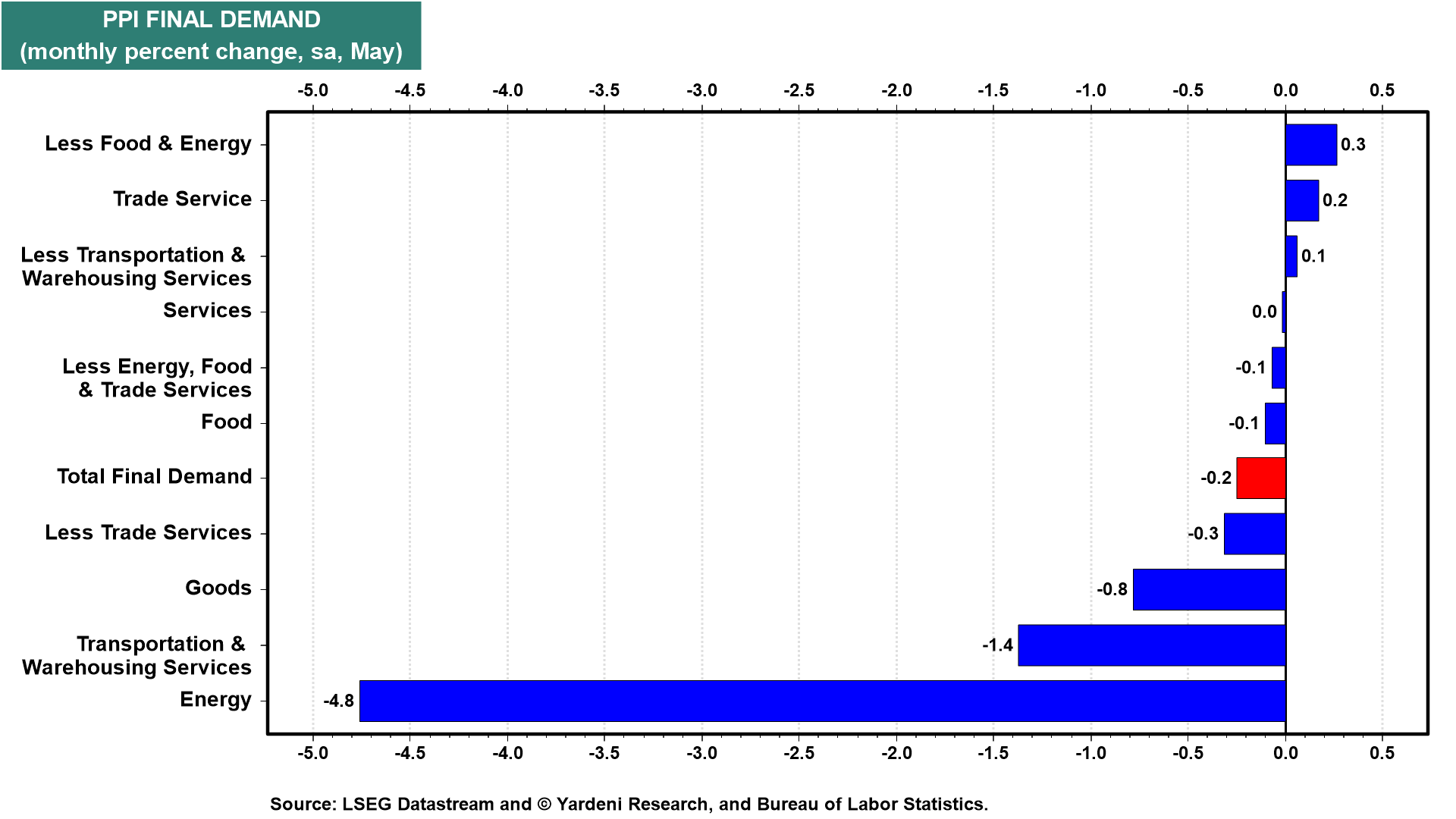Today's PPI report showed that the producer price index fell 0.2% m/m in May (chart). The drop was led by a 4.8% drop in energy prices. Excluding food and energy, the PPI was up 0.3% and down 0.1% also excluding trade services (i.e., a measure of profit margins).