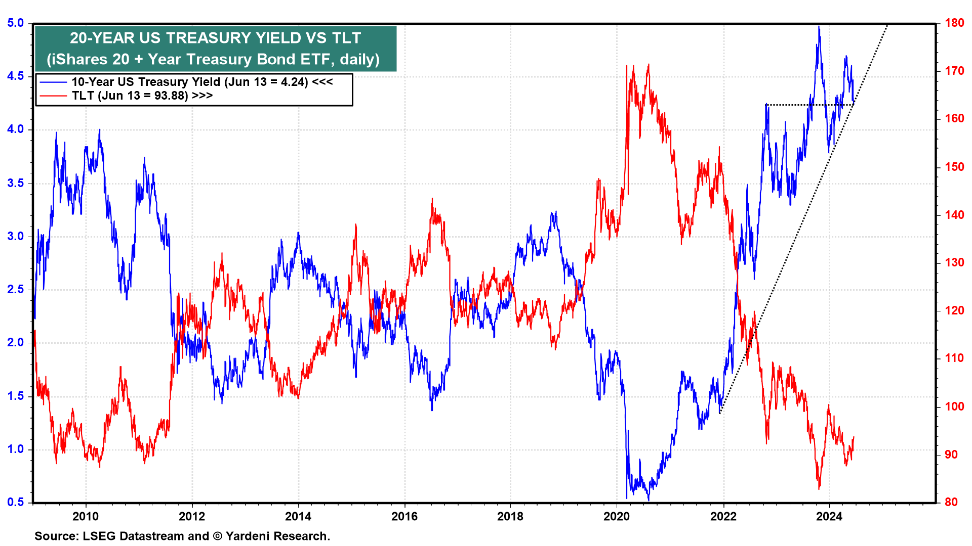 On Wednesday, the Federal Open Market Committee (FOMC) warned markets to expect no more than one interest rate cut over the rest of this year. But the bulls are charging ahead anyway on May's lower-than-expected CPI and PPI inflation data yesterday and today. The 10-year US Treasury bond yield is down nearly 25bps since Monday's high to 4.24% (chart).