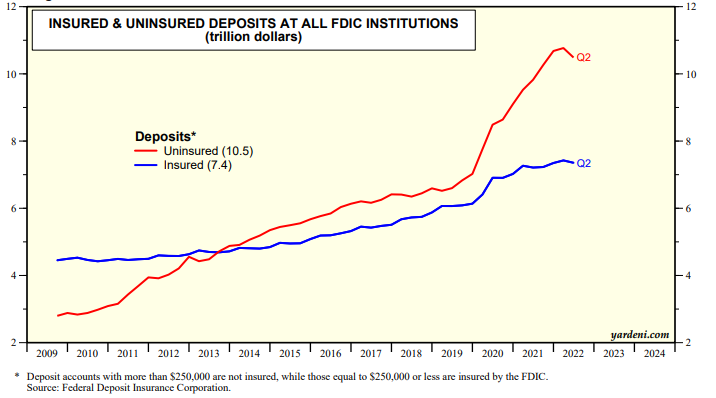 According to the FDIC $7.4 trillion of deposits are insured up to $250,000, while $10.5 trillion are uninsured (chart).