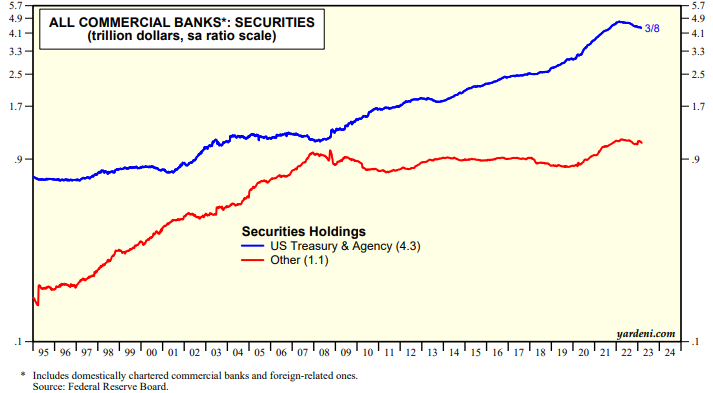 Interest rate risk has turned out to be a much bigger problem than credit risk for the banks during the current monetary policy tightening cycle. Then again, as long as the securities are held to maturity, unrealized losses don't have to be realized unless the banks have to sell them if they are faced with bank runs. In any case, they are forced to raise their deposit rates to be competitive with money market rates to halt disintermediation. Doing so hits their profitability since they can't raise interest rates on all their current loans.