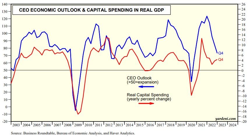 Inflation-adjusted capital spending rose 4% y/y during Q4. That was a solid increase. However, it may be starting to slow. The CEO Outlook Index compiled by the Business Roundtable fell most of last year as the Fed's interest rate hikes heightened recession concerns (chart).