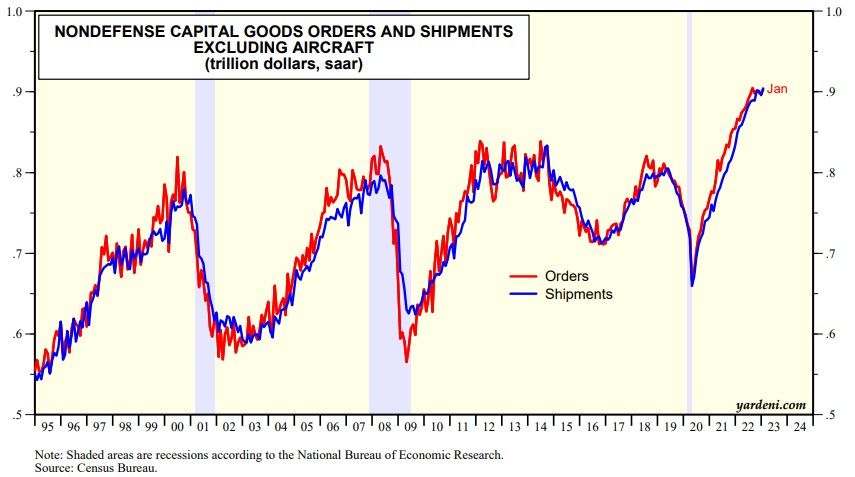 Nondefense capital goods orders excluding aircraft have stalled at a record high in recent months through January (chart). The weakness in primary metals, fabricated metal products, and machinery has been offset by record highs in electrical equipment, appliances, & components and motor vehicles and parts.