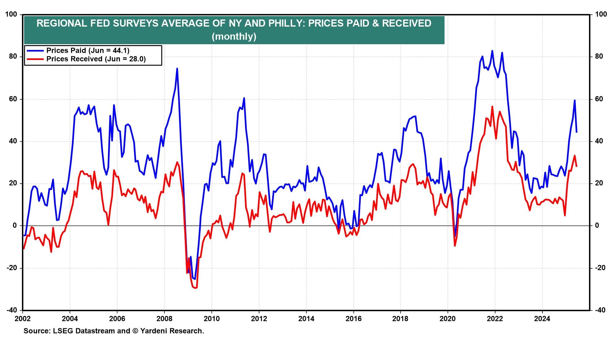 The average of June's prices-received and prices-paid indexes for the New York and Philly Fed districts rose sharply earlier this year, but might have peaked in May, as both indexes dipped in June.