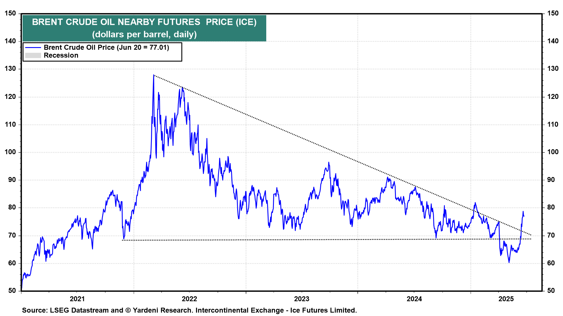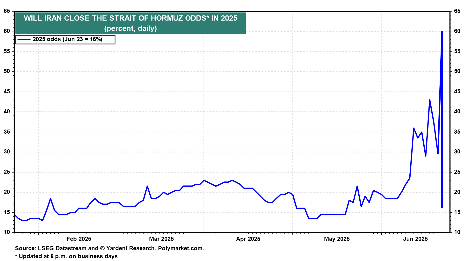 Stock prices rallied on the news because it greatly reduced the likelihood that Iran would retaliate by blocking the Strait of Hormuz. Polymarket.com showed that the odds of this outcome plunged from 60% on Sunday to 16% today (chart). The odds of a US recession in 2025 edged down to 27% today from 66% on May 1. Instead of a blockade, we had reckoned that Iran would sue for peace. This evening, Trump declared on social media that the "12 day war" between Israel and Iran was set to end in a ceasefire. (There was no immediate word from either country on the ceasefire, and the terms of the announced deal were unclear.)