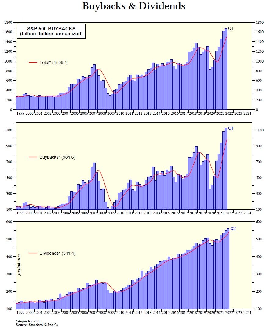 However, Corporate America continues to pour some of its massive cash flow to investors through buybacks and dividends, which together totaled a record $1.51 trillion over the past four quarters through Q1-2022 (chart).