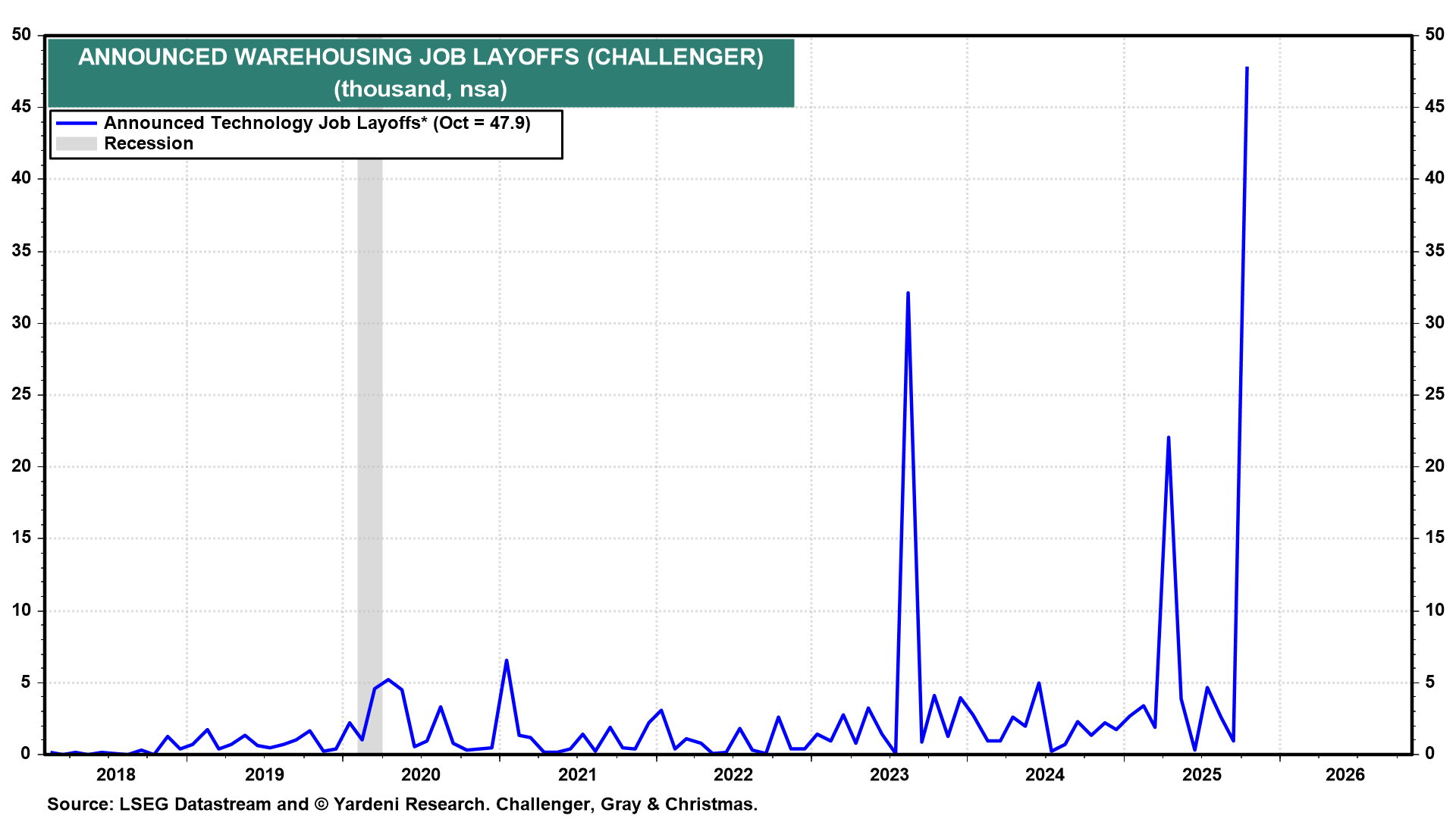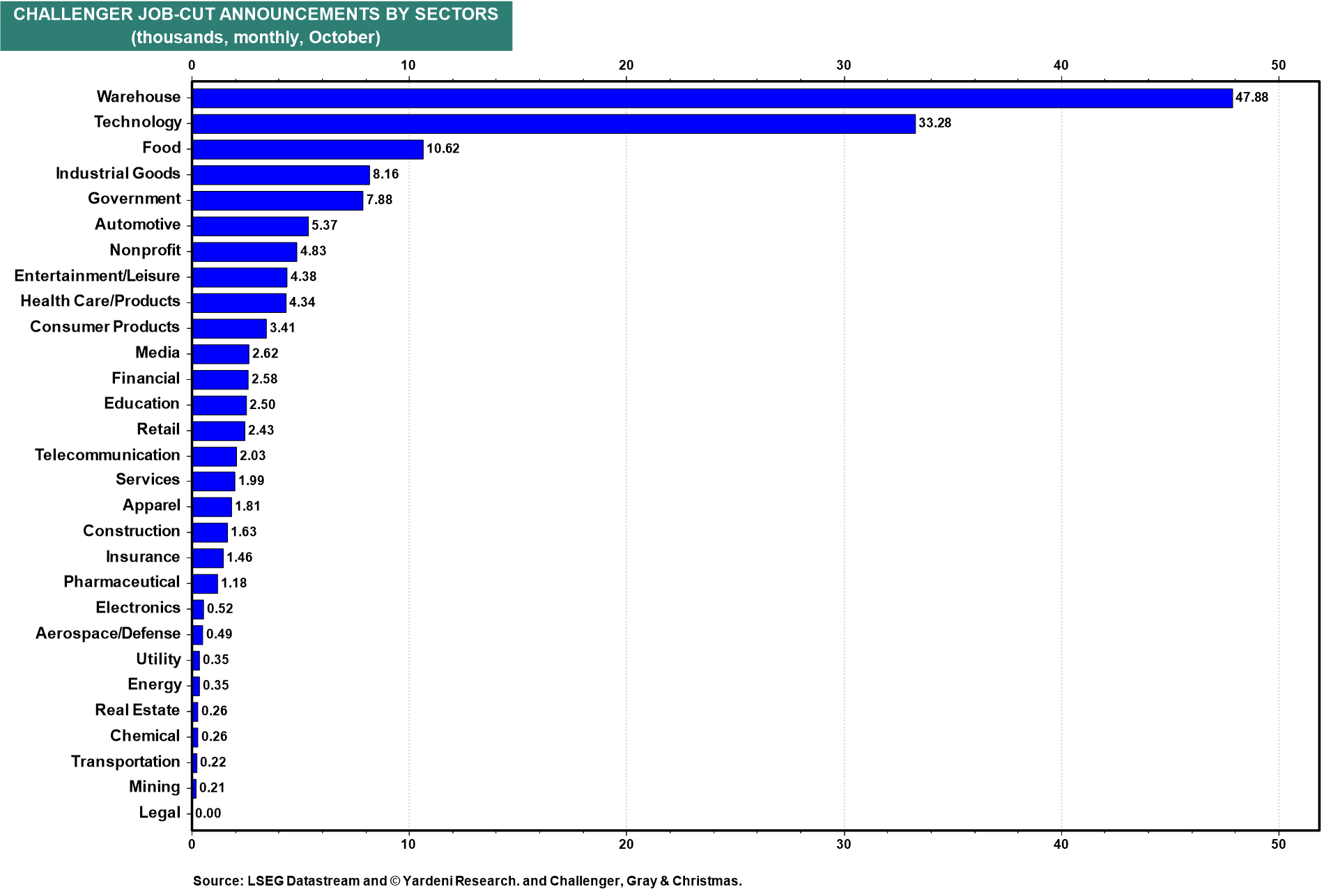 Most of October's announced layoffs occurred in the warehouse and technology industries (chart). Automation and robotics are boosting productivity in warehousing. AI is doing the same in technology.