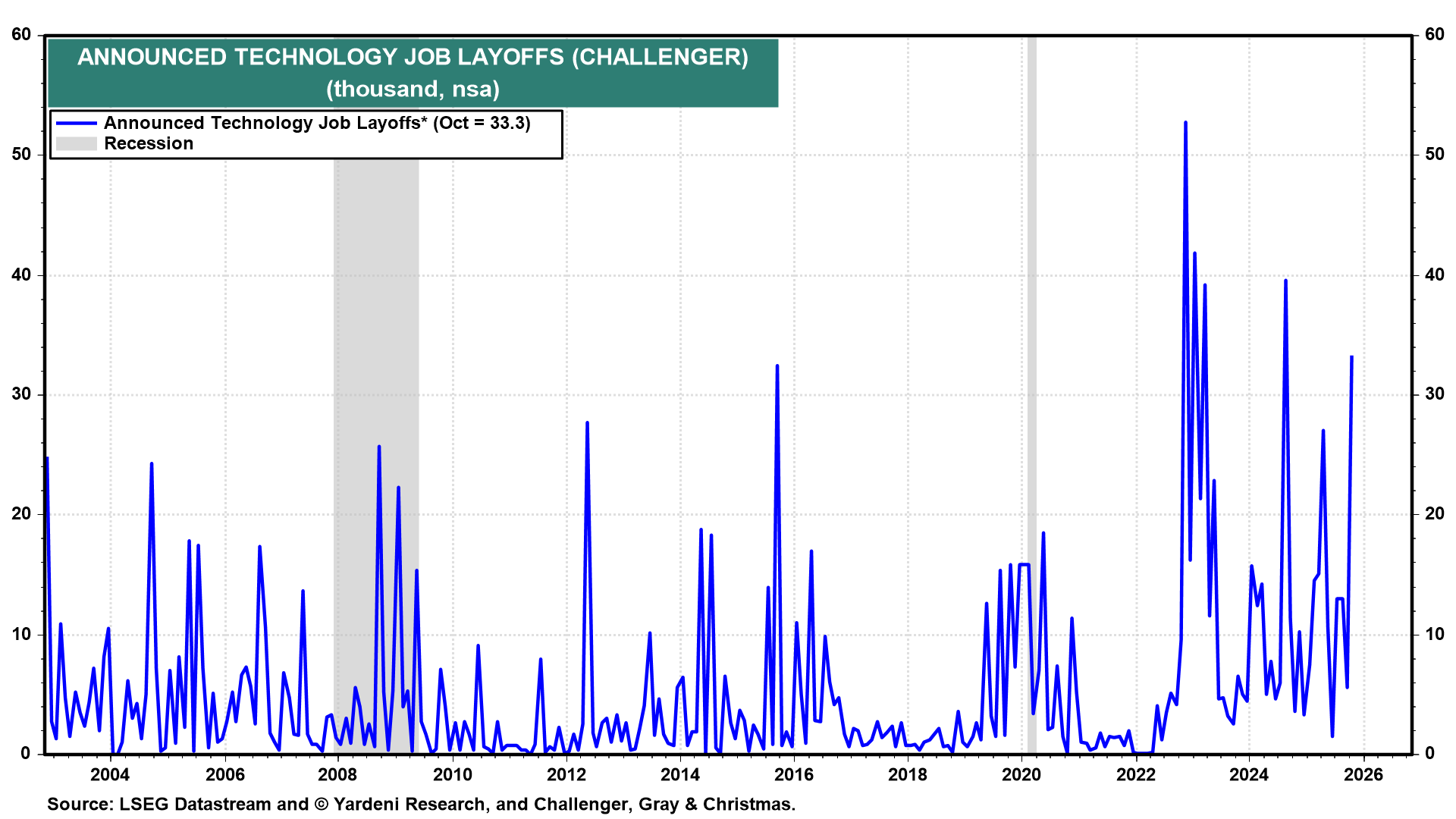 That headline is somewhat sensational. It refers to the past 12 months through October. The actual number of layoffs during the month was 153,074, as the report notes in its first sentence (chart). So far, October's jump hasn't been confirmed by initial unemployment claims. The official data are available only through September 19 because of the government shutdown. But Bloomberg News estimates that jobless claims decreased to about 218,000 in the week ended October 25 from a revised 231,000 in the prior week. Those are low readings.