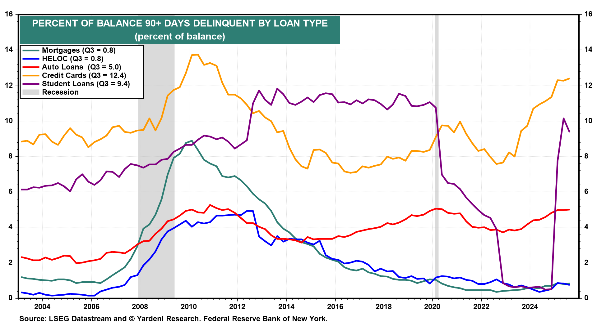 Yesterday, the Federal Reserve Bank of New York released its quarterly report on consumer debt. The good news is that delinquencies remain very low for mortgage and HELOC debt (chart). However, delinquencies on credit card, student loan, and auto loan debt are signaling financial stress. That's mostly among low-income debtors. They may be forced to cut back on discretionary spending. However, we believe that Baby Boomers, who are retiring with a record net worth of $80 trillion, will continue to boost overall consumer spending.