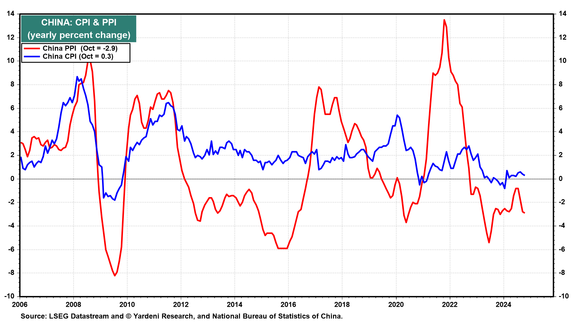 (1) China's CPI rose just 0.3% y/y in October, down from 0.4% (chart). Core CPI "surprised" by rising 0.2% y/y, up from 0.1% in September. October's PPI inflation rate sank further from -2.8% to -2.9%. That will continue to weigh on US import prices and therefore on the core goods CPI (chart).