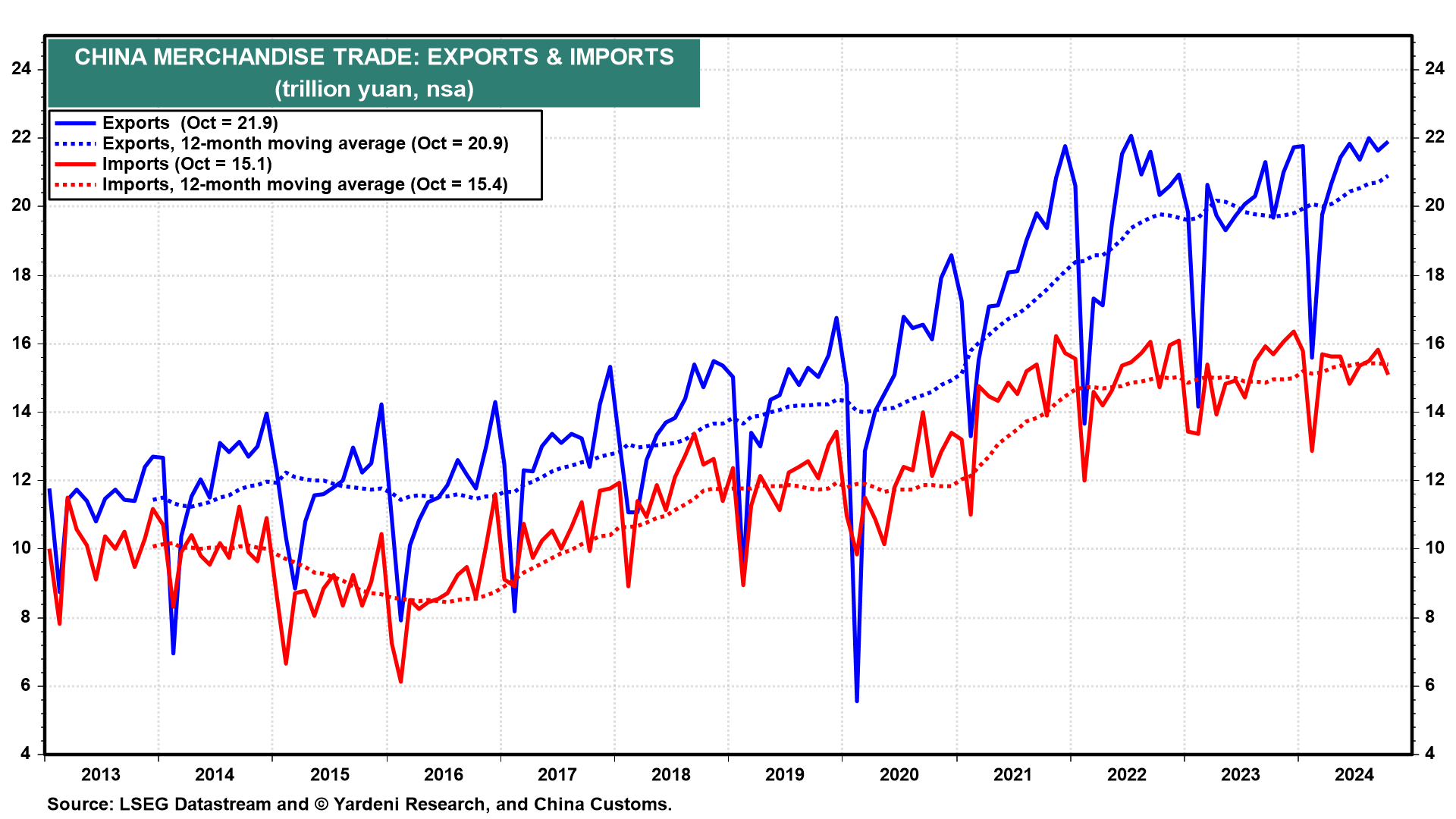 China's government encouraged manufacturers to export more goods, which has deflated consumer goods prices in the US and in other importers of Chinese goods. But China's economy remains weak as evidenced by flat imports (chart). The government seems to lack the will, or the way, to stimulate consumer demand. China announced a $1.4 trillion financing package on Friday. That's a big number, but it will mostly go to cleaning up and refinancing local government debt.