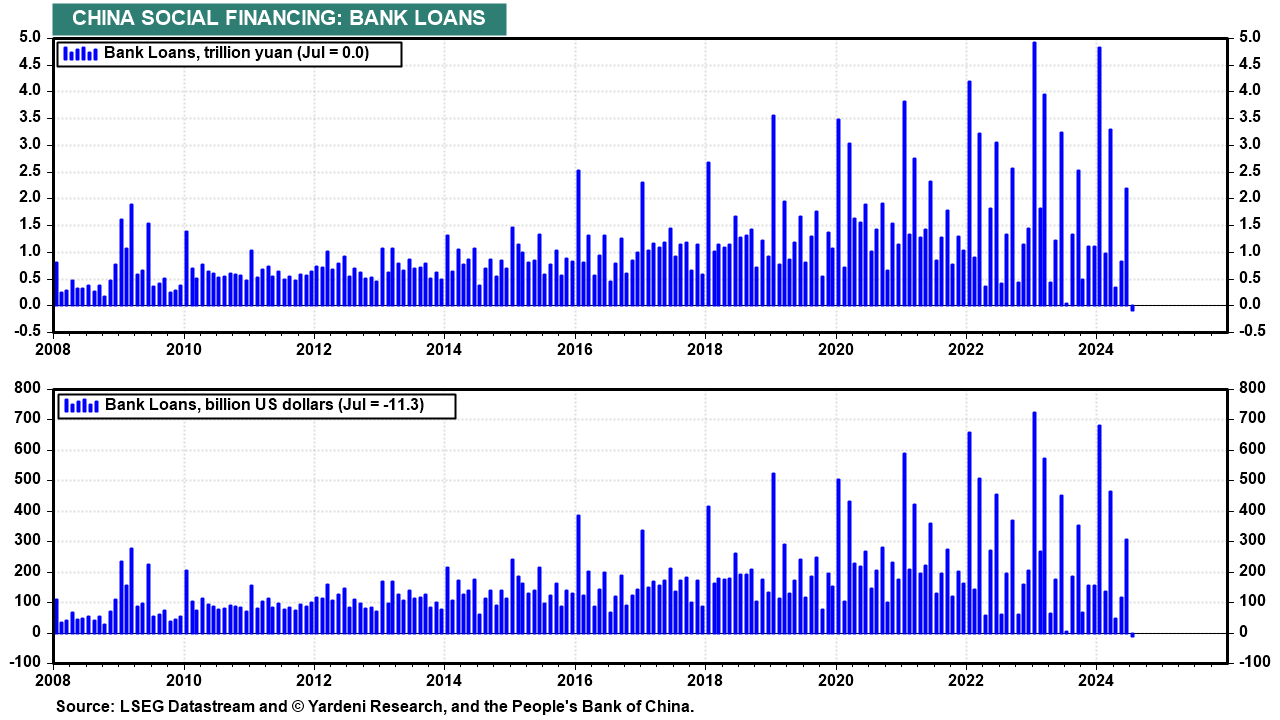 China's economy is faltering. July data suggest the government will have to provide more stimulus to meet its 5% economic growth target for the year. Most striking is the small but unusual decline in bank loans during the month (chart). It suggests a lack of confidence among businesses and consumers, potentially leading to reduced investment and spending.