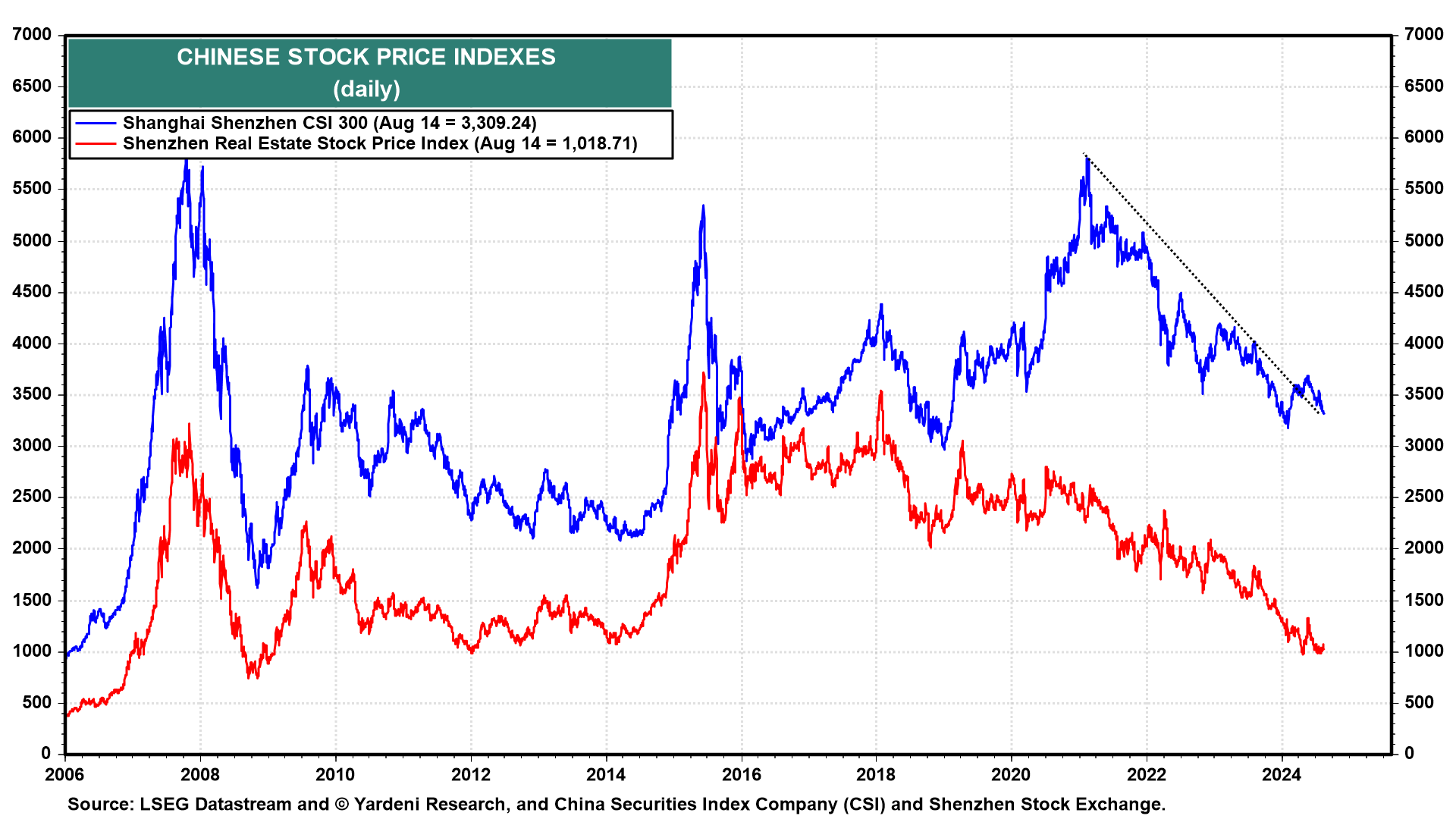 In July, home prices in China continued to decline. New home prices fell for the 13th consecutive month, dropping by 0.7% m/m and 5.0% y/y, the steepest annual decline in nine years (chart). Despite efforts by the Chinese government to stabilize the housing market, including reducing mortgage rates and lowering home buying costs, these measures haven't worked so far.