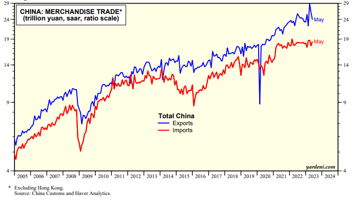 The Chinese government started to lift its pandemic lockdown restrictions in early December last year. The economic rebound has been weaker than widely expected. Indeed, China's imports have been flat at a record high since mid-2021 and have remained so through May of this year (chart).