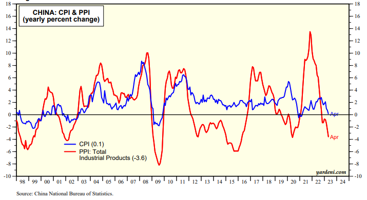 Furthermore, inflation has been nonexistent as the Chinese CPI rose just 0.1% y/y in April, while the country's PPI fell 3.6% over the same period (chart).