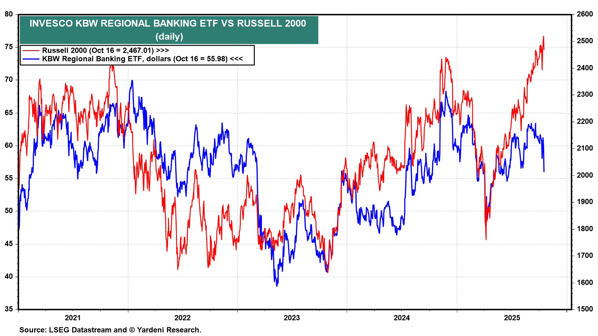 The Financial sectors of the S&P 500, S&P 400, and S&P 600 have been weak in recent days (chart). The larger banks that reported their Q3 earnings results on Tuesday and Wednesday mostly beat expectations, driven by better-than-expected investment banking revenues. They are included in the S&P 500.