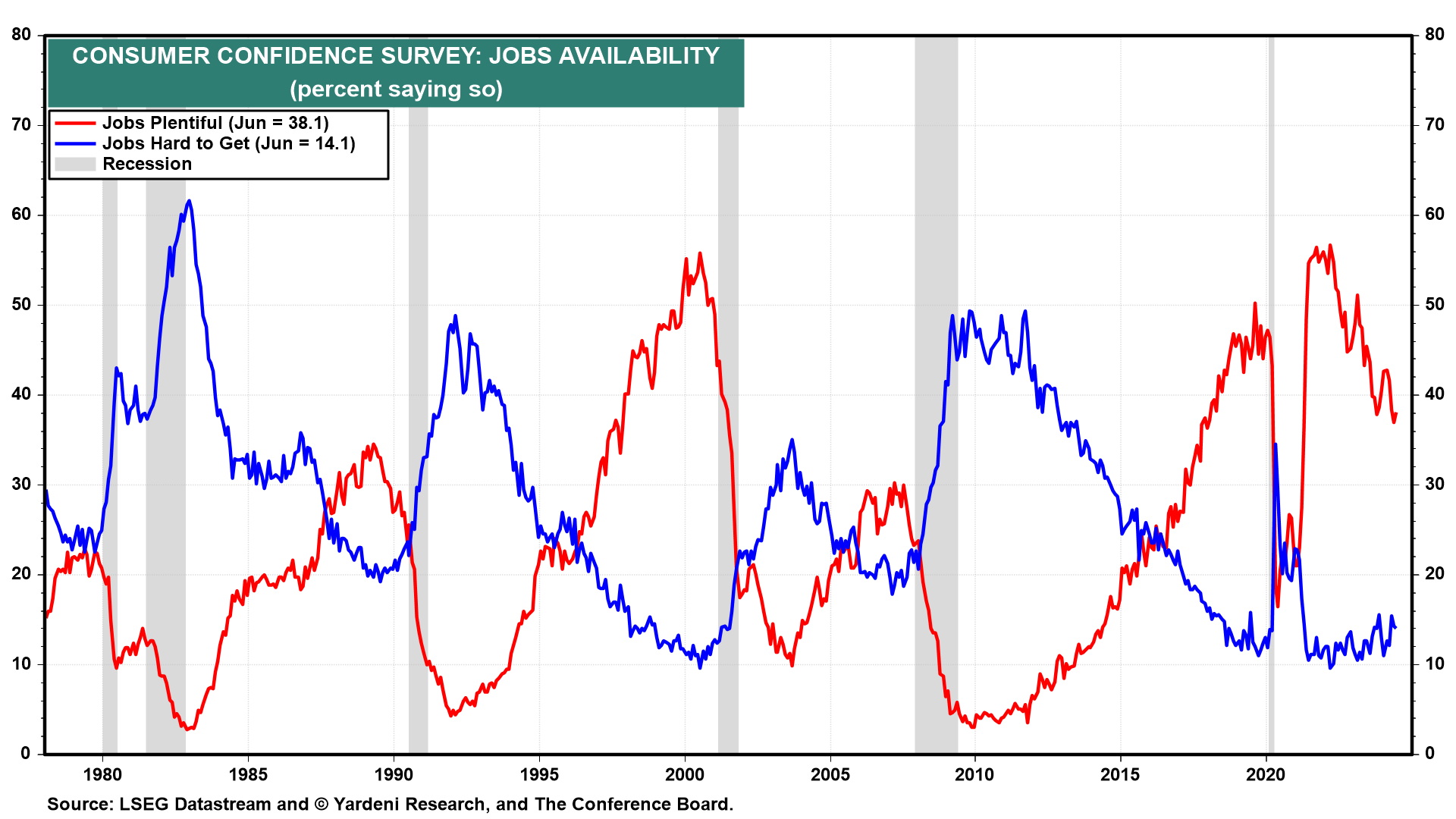The first available monthly indicator of the labor market is the "jobs plentiful" series in the Consumer Confidence Index (CCI) survey. Today, June's reading showed that 38.1% of respondents said so (chart). That's a slight uptick from May, and a relatively high reading. The "jobs hard to get response" ticked down to 14.1%, which is a very low reading.