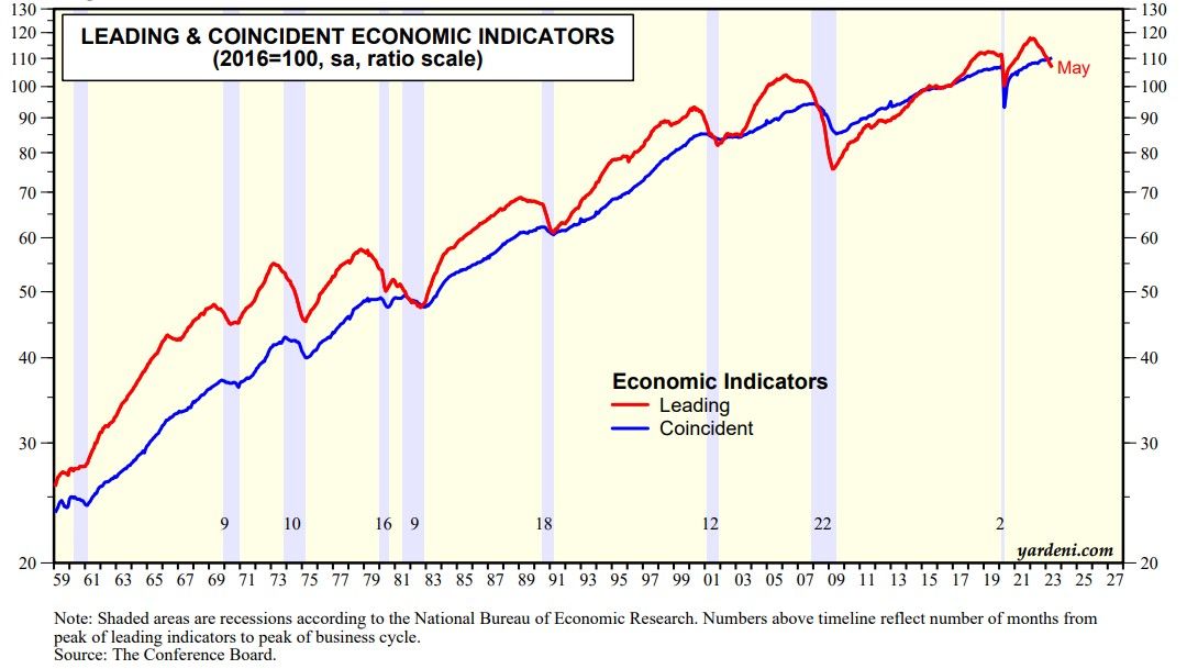 The Index of Leading Economic Indicators (LEI) peaked at a record high during December 2021. It dropped 0.7% m/m in May and declined for the 14th month in a row, but there’s still little evidence the US is headed toward recession. Indeed, the Index of Coincident Economic Indicators (CEI) edged up by 0.2% m/m during May to yet another record high (chart). The Conference Board, which compiles both the LEI and CEI, is still anticipating a recession, but now it starts during Q3-2023 and lasts through Q1-2024. We still believe that we have been in a rolling recession, making an economy-wide recession less likely.