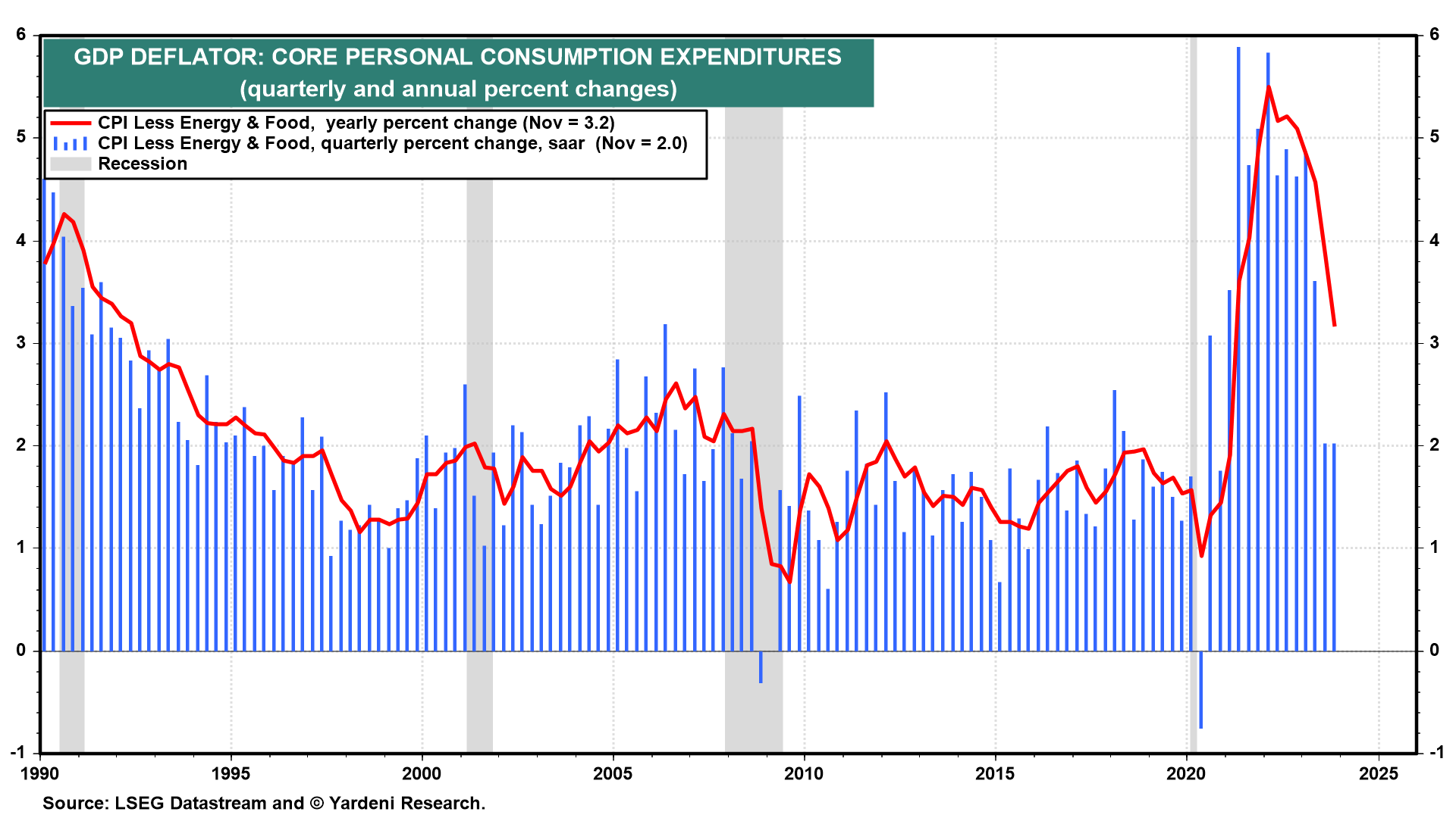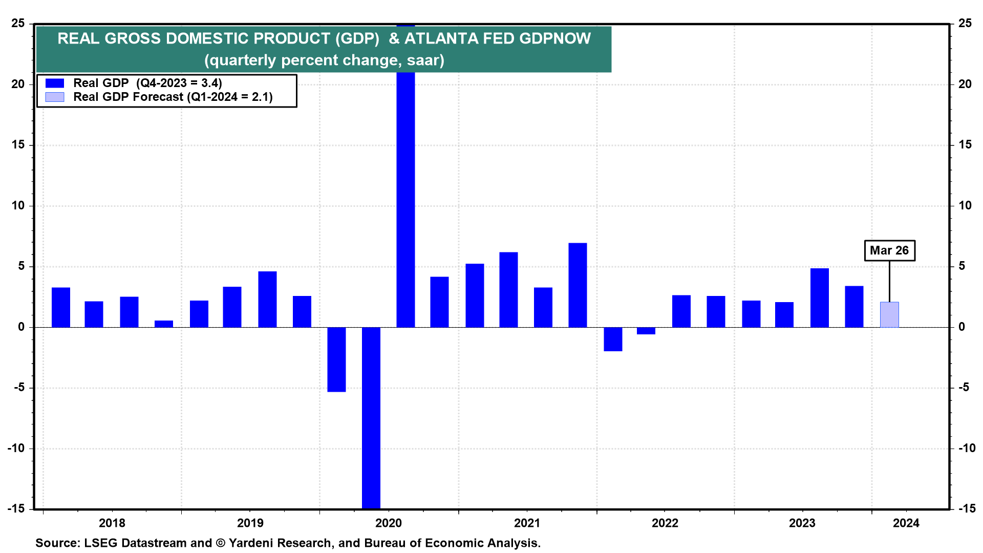 Today's batch of economic indicators was mostly sweet. Q4's real GDP was revised from 3.2% to 3.4% (chart). The Atlanta Fed GDPNow model is projecting 2.1% for Q1-2024. Consumer spending was revised up from 3.0% to 3.3% despite fears that it would be depressed by the resumption of student loan payments. We disputed that notion by observing that real wages and salaries were growing solidly during the last three months of 2023. We also disputed the running-out-of-excess-savings thesis promoted by the hard landers. Corporate profits rose to a record high at the end of last year.