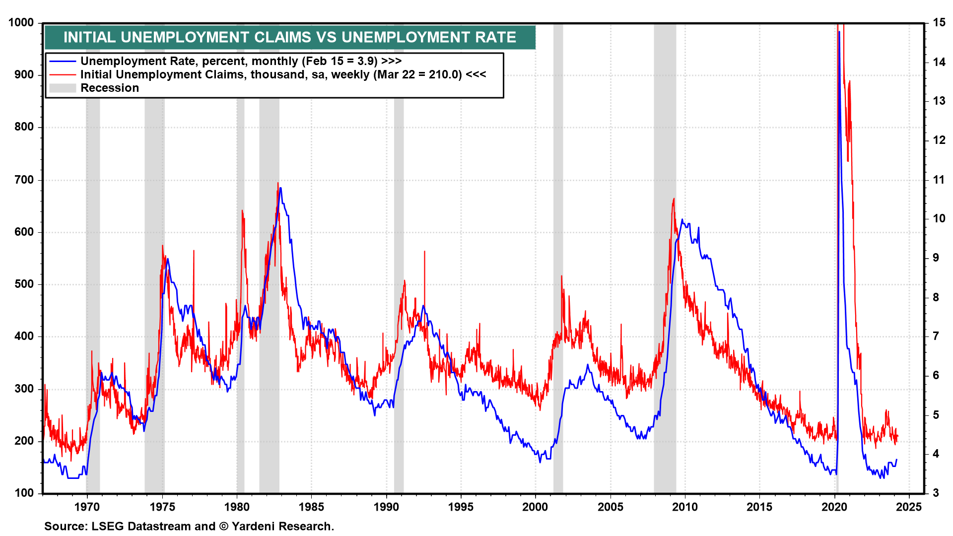 Last, but not least, initial unemployment claims remained low at 210,000 during the March 22 week (chart). This suggests that the unemployment rate might have remained below 4.0% during March for the 26th month in a row.
