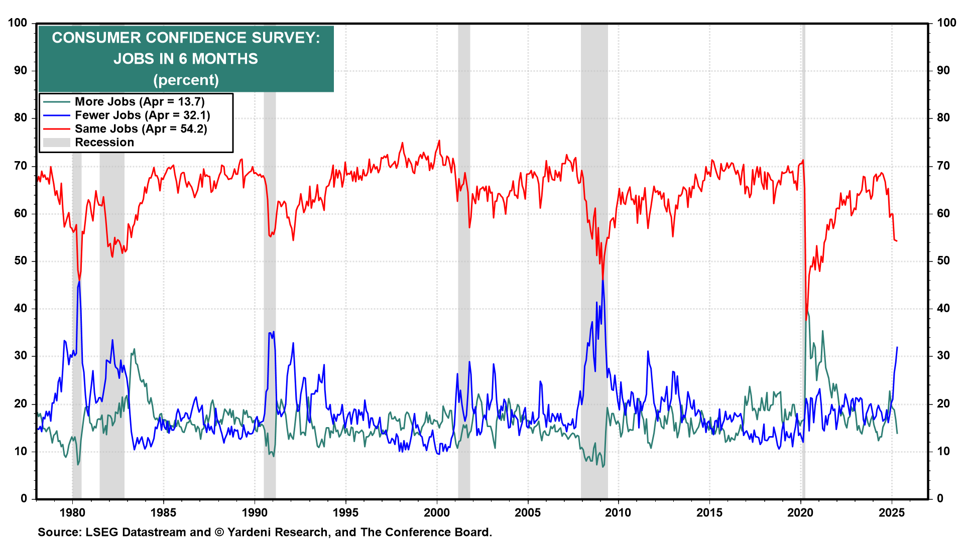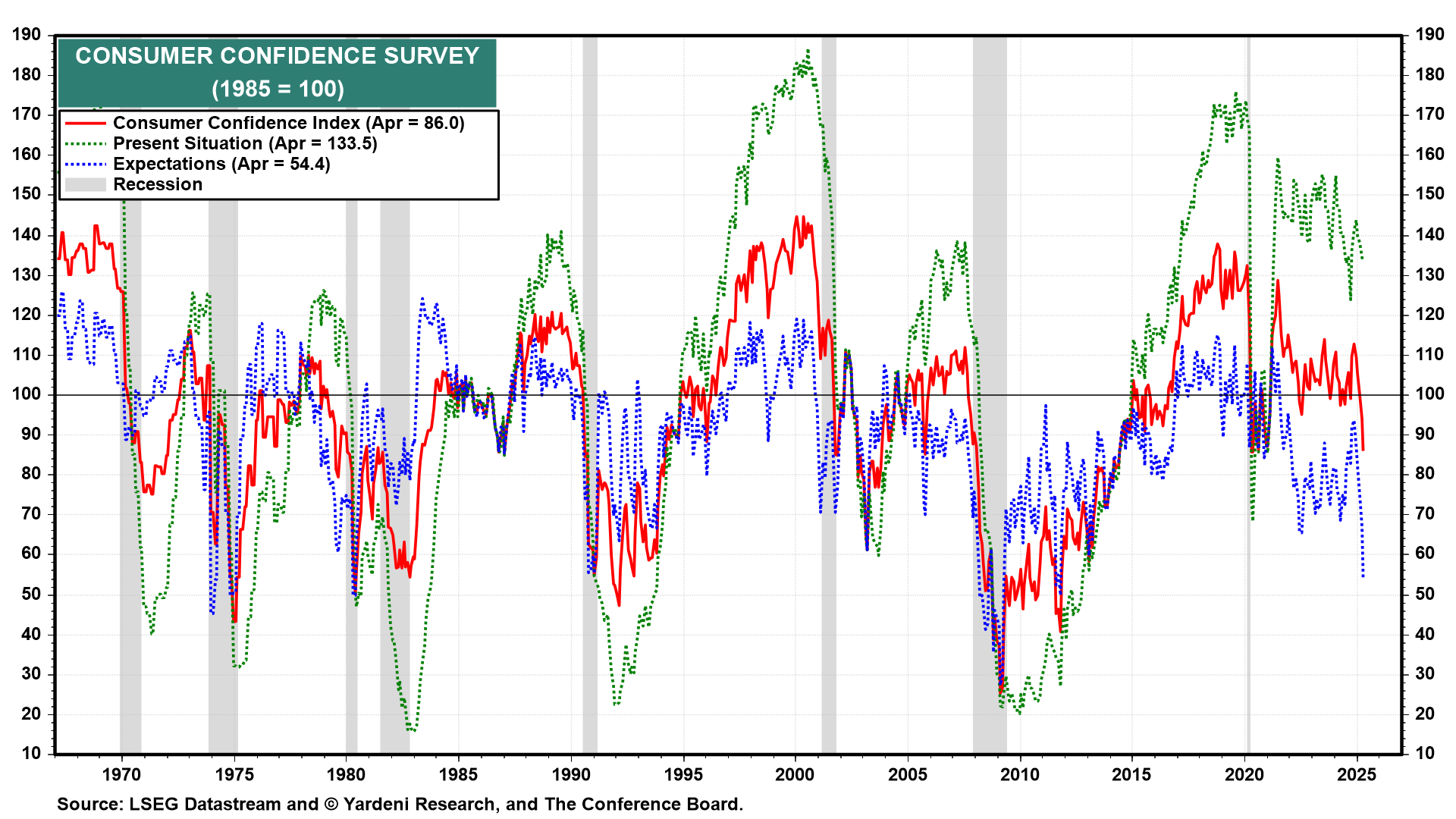 Judging from the Conference Board's CCI, consumers have become more depressed in recent months (chart). The index fell to a nearly five-year low in April, down 8 points to 86.0. It's the fifth straight monthly decline, the worst such stretch since 2008. The decline has been led by the CCI's expectations component. The present situation component is relatively upbeat!