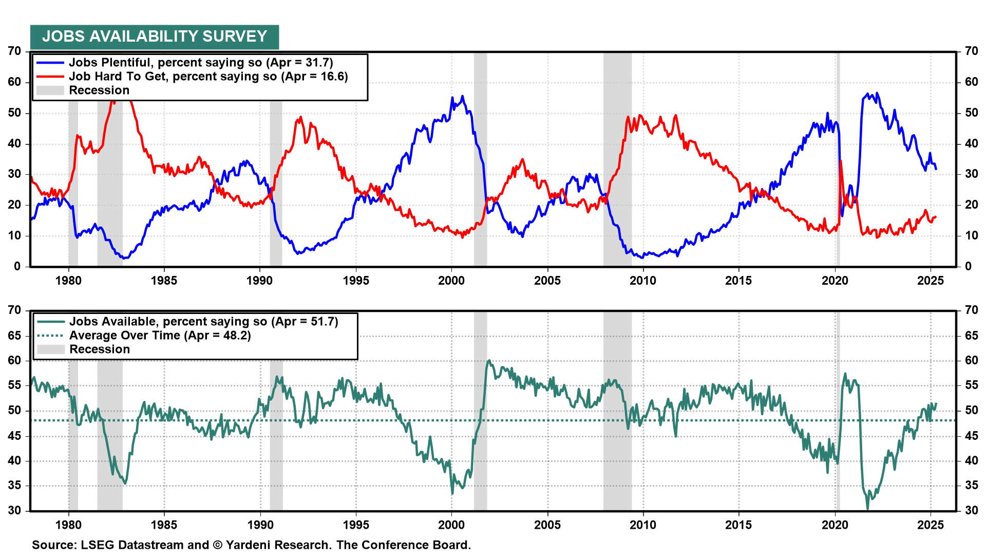 Current assessments of the availability of jobs are holding up relatively well. The ratio of respondents saying jobs are plentiful is roughly double the number saying jobs are hard to get—31.7% and 16.6%, respectively (chart).