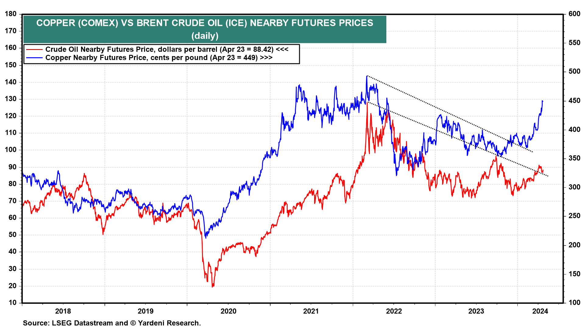 Is the global economy suddenly taking off? It seems that way given the sudden vertical ascent of several metals prices, particularly those of copper, aluminum, tin, and zinc. On the other hand, the price of a barrel of Brent crude oil has slipped recently, suggesting that its recent advance had more to do with a rising geopolitical risk premium than a resurgence of global growth (chart).
