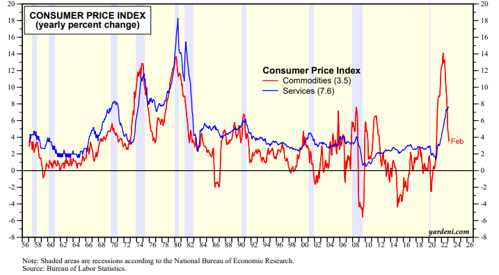 CPI goods inflation peaked last summer around 14.0%. It was down to 3.5% in February (chart). In other words, it has been transitory. CPI services inflation has been persistent rising to 7.6% during February.