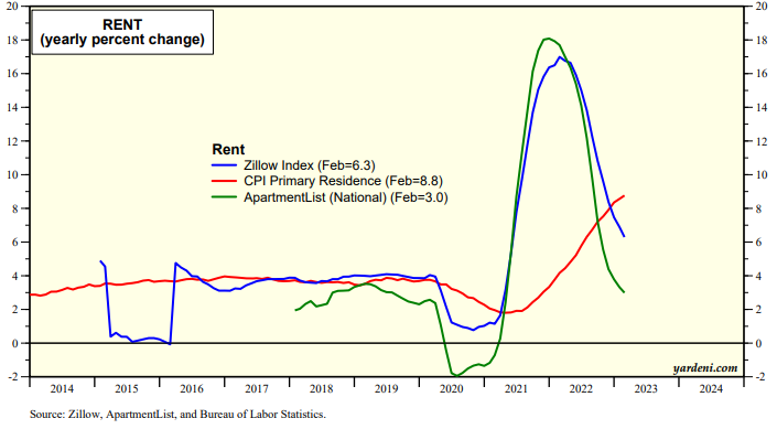 Rent inflation has been a major contributor to the surge in services inflation. CPI tenant rent rose 8.8% during February. It should moderate in coming months according to market-based measures of current rent inflation (chart).