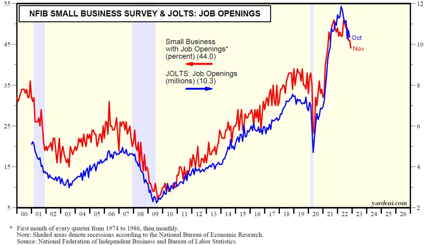 The percent of small business owners with job openings fell to 44% during November. That’s down from a record high of 51% during May of this year. But it is still very high. This series closely tracks the job openings series included in the JOLTS report (chart). Fed officials have indicated that they would like to see fewer job openings to take the pressure off wages. Both series are heading in the right direction, but not fast enough. Indeed, a near record 28% of small business owners are planning to raise worker compensation.