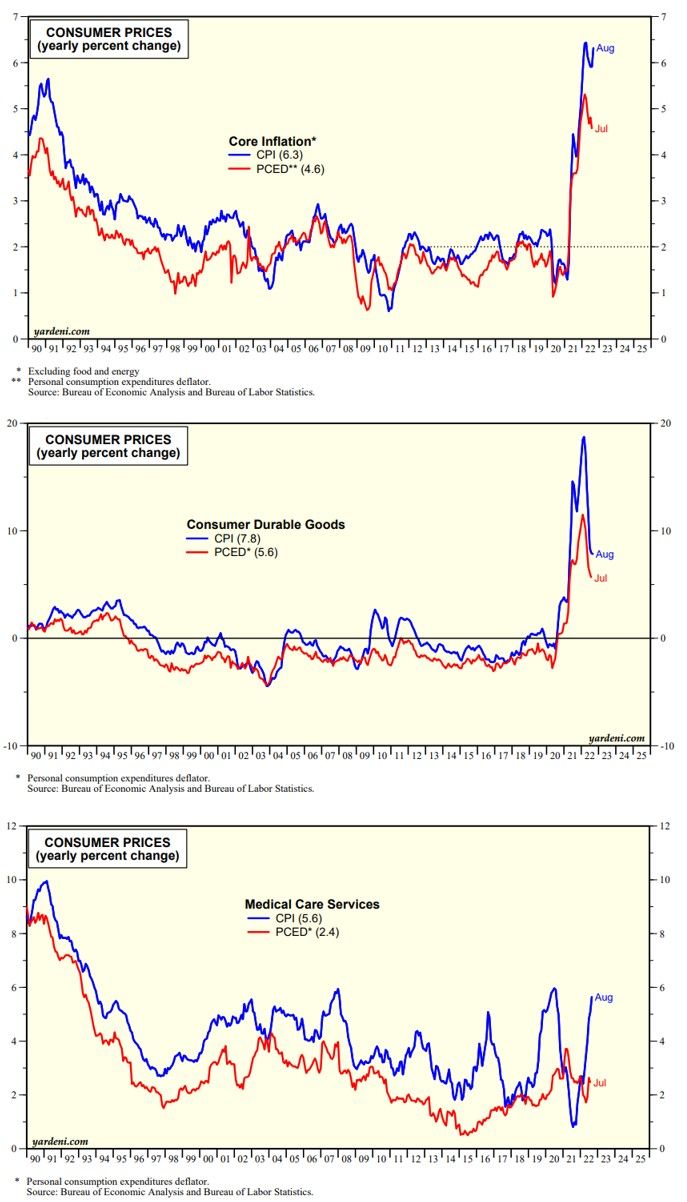 (1) The core CPI inflation rate tends to be higher than the core PCED. That's because the inflation rates of both durable goods (especially furniture & bedding) and medical care services (especially hospitals) tend to run hotter in the former compared to the latter (charts below).