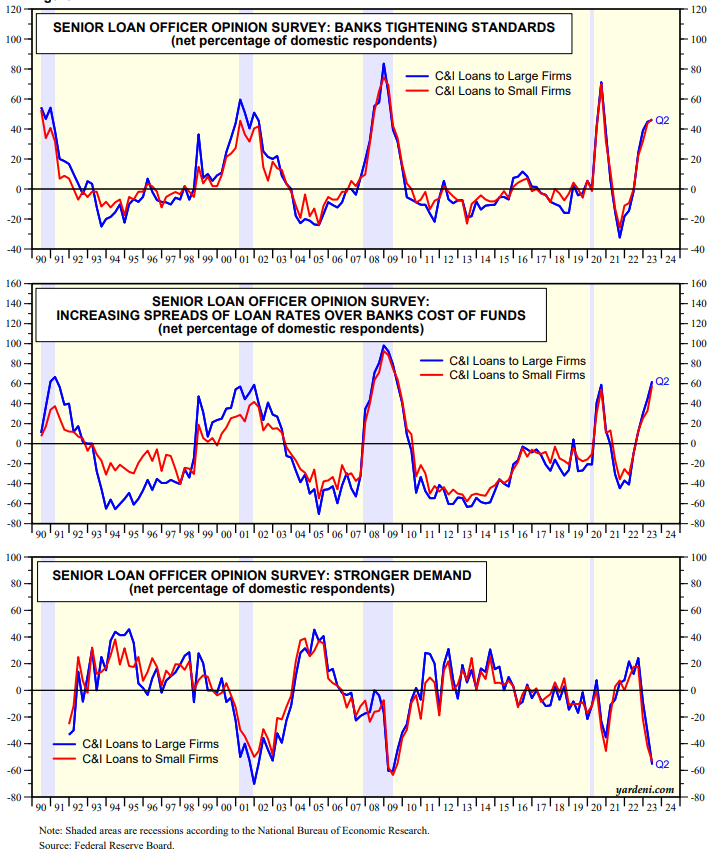 The Fed's Senior Loan Officer Opinion Survey was released yesterday after the market's close. It showed that banks continued to tighten their lending standards following the banking crisis that started during the second week of March (chart). Yet the DJIA barely budged falling 56.88 points and the S&P 500 lost just 0.46%. The S&P 500 VIX ended the day at 17.7. The spread between the yields on US high-yield corporate bonds and the 10-year Treasury note continued to meander around 500bps, as it has for the past year.