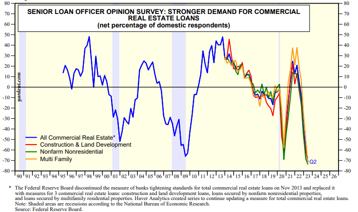 The Fed noted that "banks reported expecting to tighten standards across all loan categories" over the remainder of 2023. According to April's SLOOS, the demand for commercial real estate (CRE) loans was the weakest on record starting in the mid-1990s (chart).