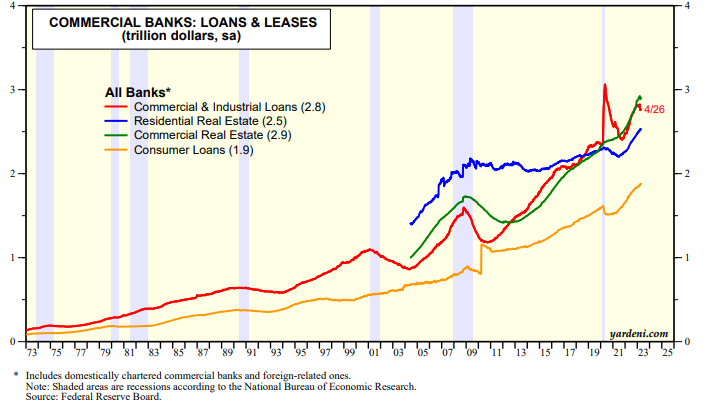 So should we run for the hills? We note that December's SLOOS showed that credit conditions were tightening before the banking crisis, yet the four major categories of commercial bank loans all ended in record high territory through the end of April (chart). We will continue to monitor the weekly data on actual lending to assess whether loan officers are cutting back on their lending by as much as suggested by the latest SLOOS. Stay tuned.