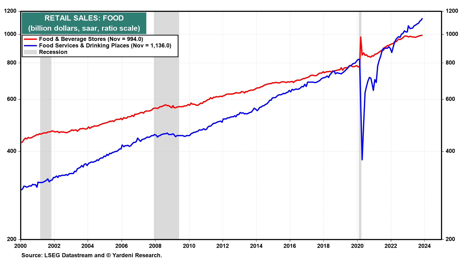 The plunge in mortgage interest rates since early November undoubtedly will boost new and existing home sales. That should give a boost to housing-related retail sales on appliances, furniture, and furnishings. The rolling recessions in housing and housing-related retailing should turn into rolling recoveries for both.