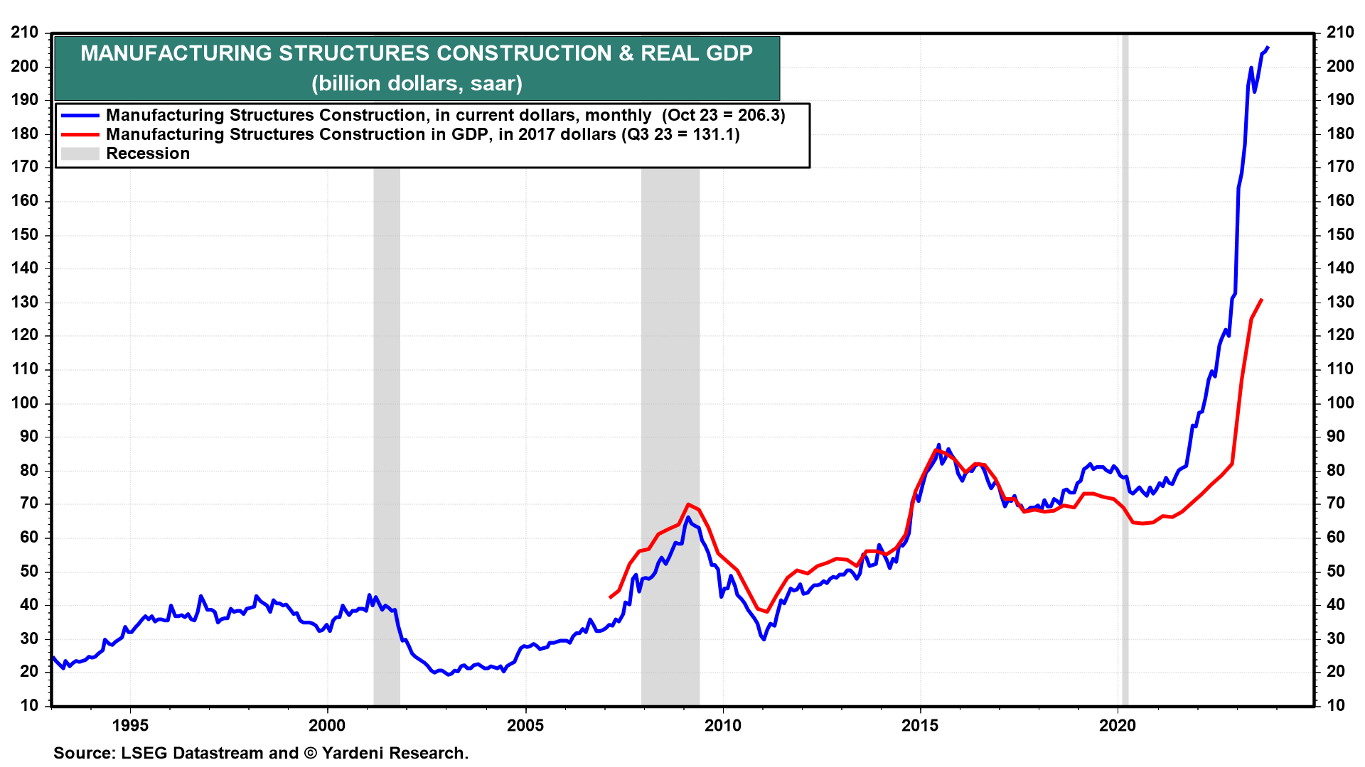 The onshoring boom and the federal government’s increased spending on public infrastructure are boosting new orders for construction machinery, which is up 30.5% over the past 24 months through October (Fig. 14). Onshoring and infrastructure investment also explain why construction employment rose to yet another record high of 8.0 million during November despite the recession in single-family housing starts.