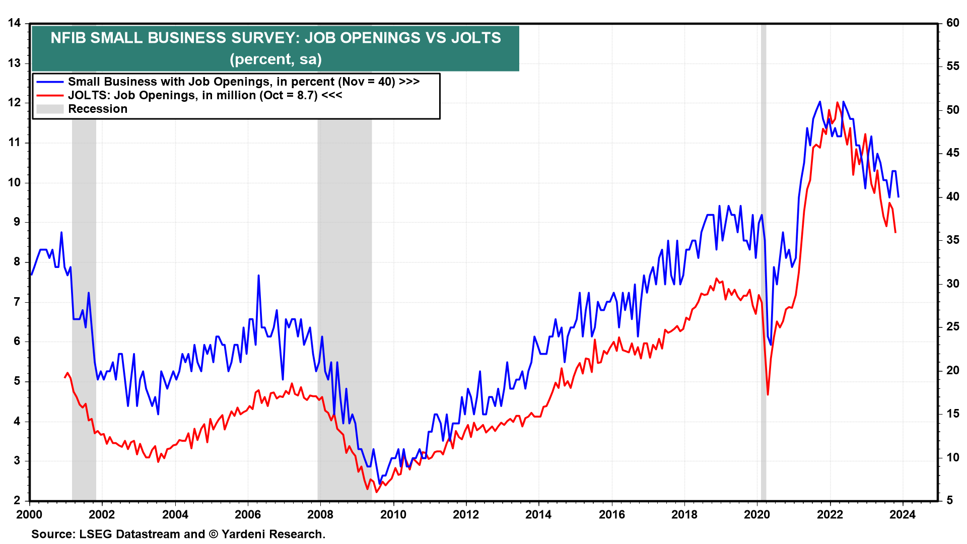 Indeed, during November, 40% of small business owners reported that they have job openings (Fig. 6 below). During October, there were 8.7 million job openings overall in the labor market versus 6.5 million unemployed that month. The labor force has increased 3.3 million during the first 11 months of this year. The household measure of employment is up 2.7 million over the same period.