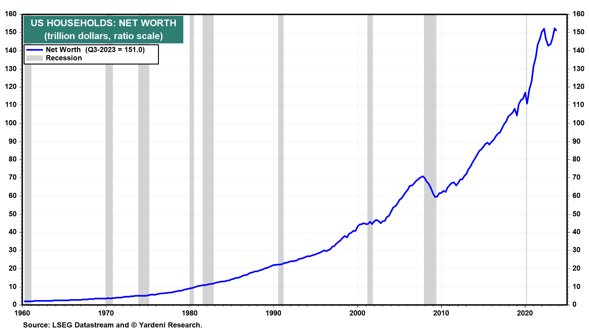 The net worth of American households totaled a staggering record-high $151.0 trillion at the end of Q3-2023 (Fig. 9 below). Their portfolios are diversified in various asset holdings that all are at or near record highs (Fig. 10). There are certainly lots of liquid assets that might be sold to buy stocks and bonds when the Fed decides to lower short-term interest rates. A record $5.9 trillion is in money market mutual funds (MMMF) with a record $2.3 trillion in retail MMMFs (Fig. 11). Commercial bank deposits in M2 totaled $17.3 trillion during the December 12 week (Fig. 12).
