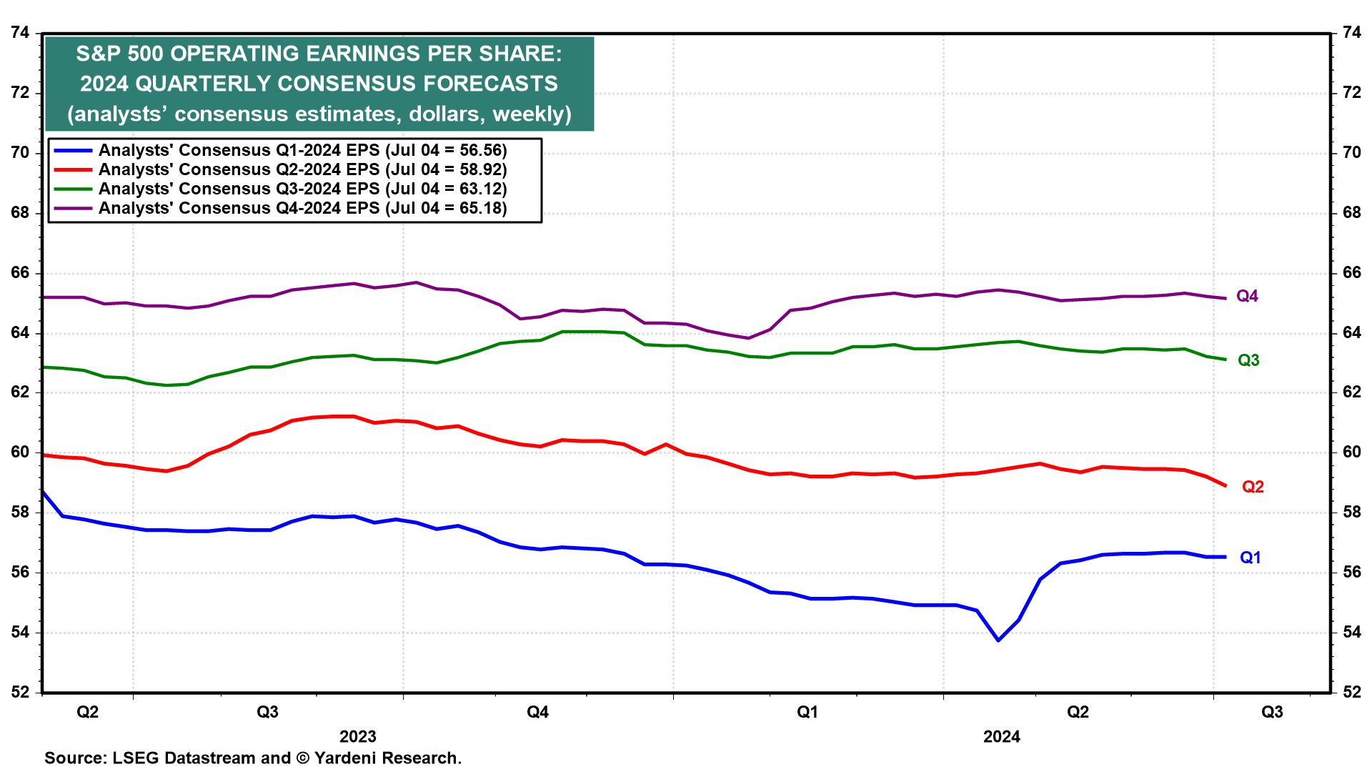 (1/5) Q2 estimate unchanged over the course of the quarter. The S&P 500’s Q2-2024 EPS estimate of $59.22 didn’t change from the start to the end of the quarter (Fig. 14 below). Typically, there’s a decline as the quarter progresses (a 2.4% drop for Q1-2024, a 5.9% drop for Q4-2023, and an average decline of 4.0% in the 120 quarters since consensus quarterly forecasts were first compiled in 1994). The quarter’s 0% change is great news and implies yet another strong earnings surprise.
