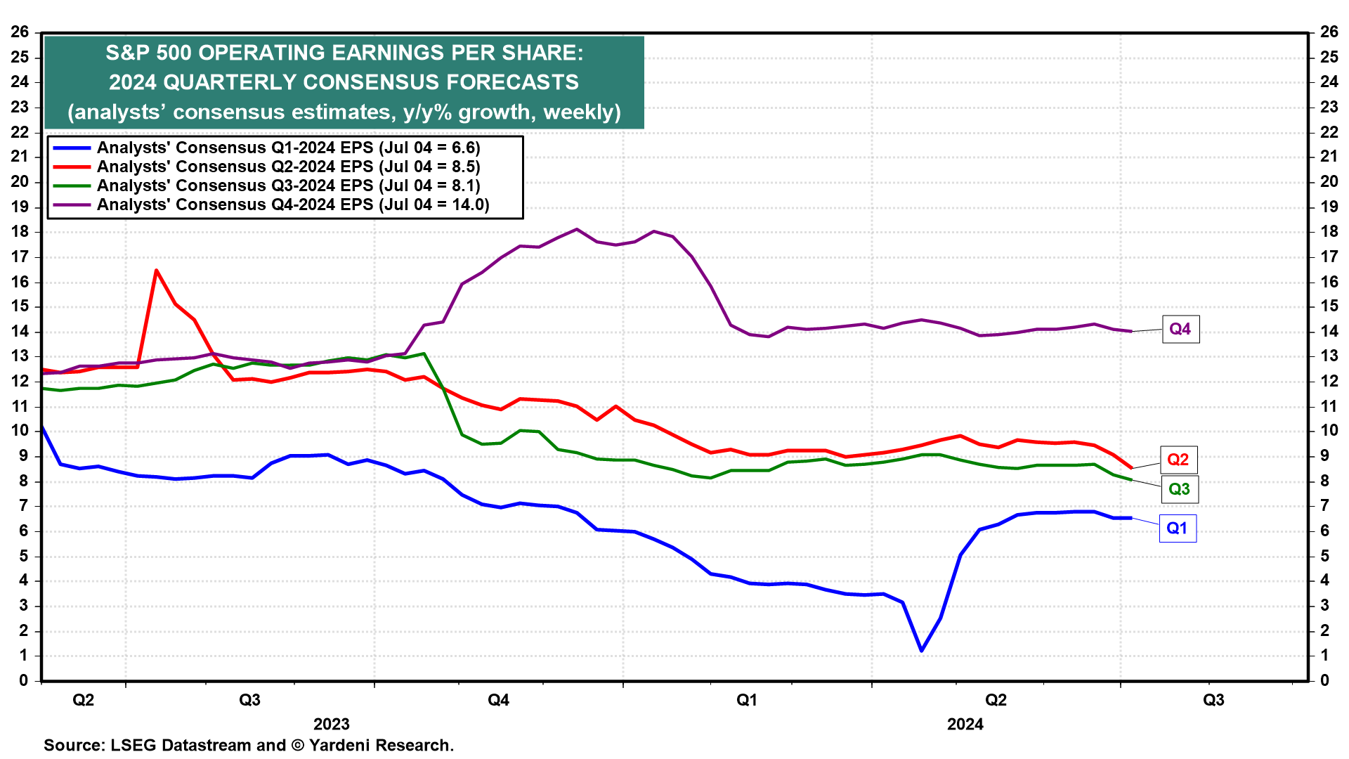 In Q2-2024, analysts expect the S&P 500’s earnings growth rate to be positive on a frozen actual basis for a fourth straight quarter following three y/y declines through Q2-2023. Their 8.5% y/y growth expectation for Q2-2024 compares to 6.6% y/y growth in Q1-2024, 7.5% in Q4-2023, 4.3% in Q3-2023, -5.8% y/y in Q2-2023, -3.1% in Q1-2023, and -1.5% in Q4-2022 (Fig. 15 below). On a pro forma basis, they expect a fourth straight quarter of positive y/y growth as well, with earnings forecasted to rise 10.1% (versus 8.2%, 10.1%, 7.5%, -2.8%, 0.1%, and -3.2% for the previous six quarters). When the dust finally clears on the Q2-2024 earnings season, we think y/y growth has an even chance of crossing into the double-digit percentage territory on both bases.