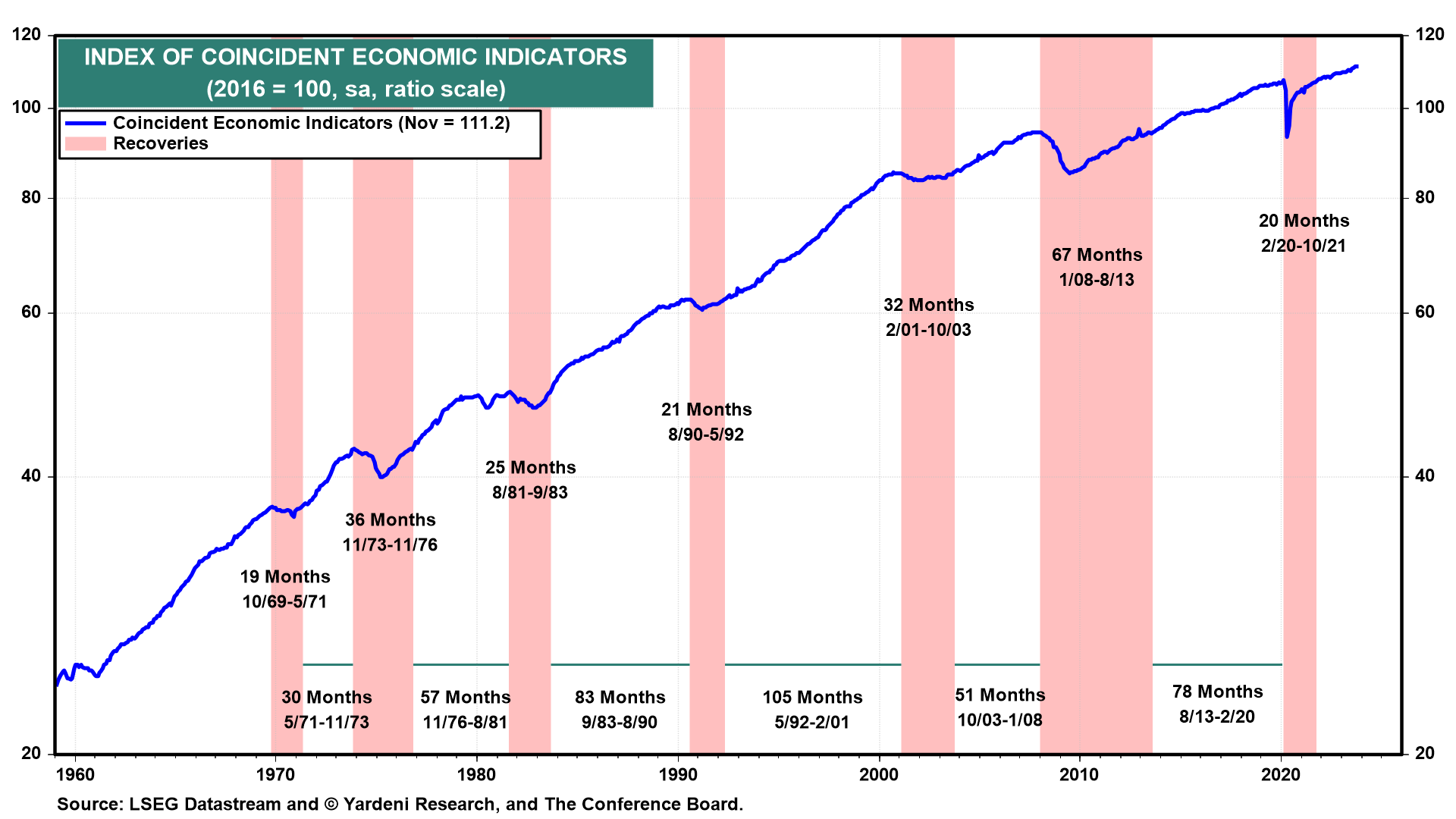 Recoveries are followed by expansions to new record highs in the CEI. The previous six post-recovery expansions lasted 67 months on average, or five and a half years! That means that the debate among the landers could last until mid-2026, if it doesn’t end sooner … or later.