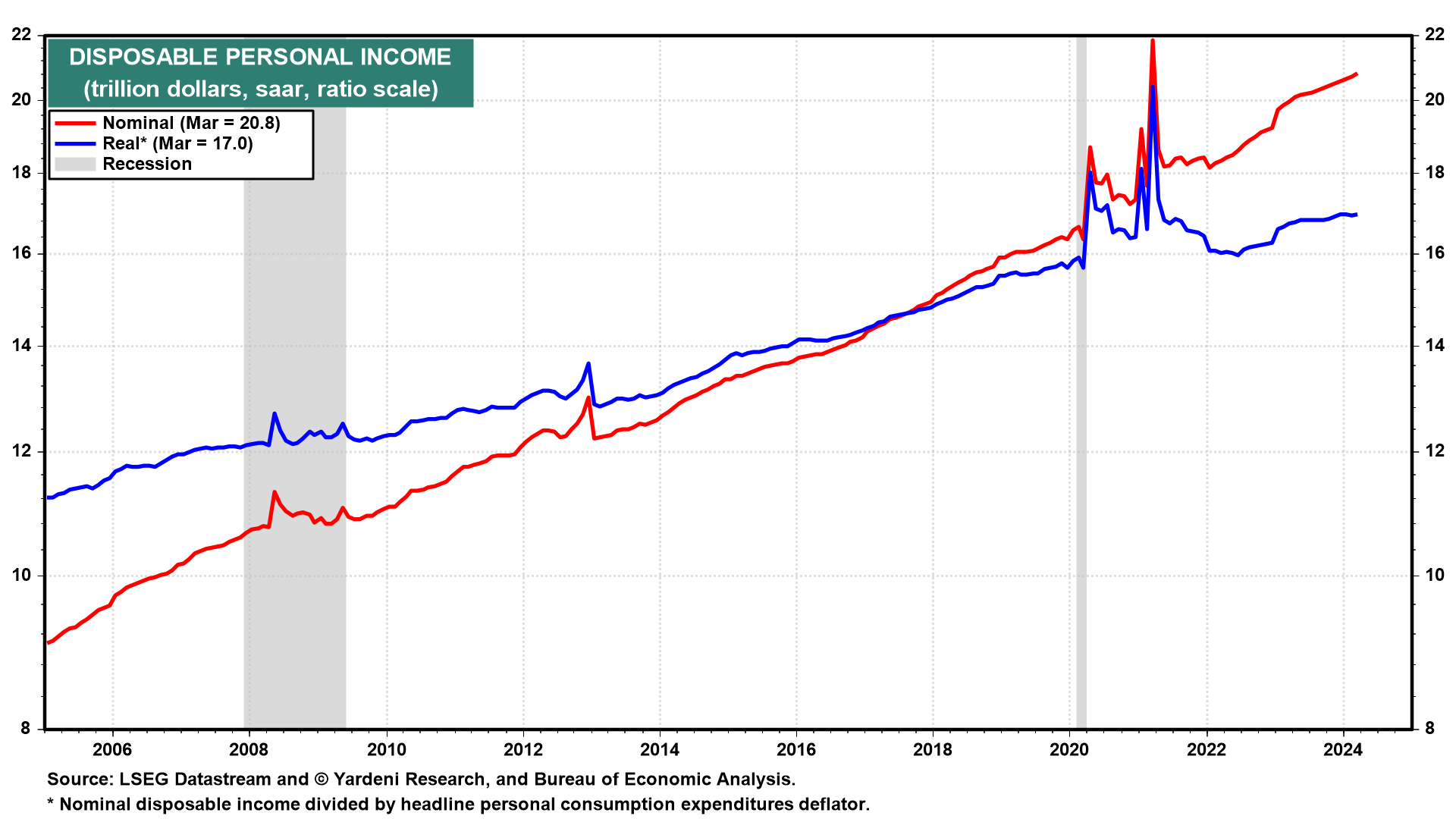 Our story is that the personal saving rate won’t rise but will remain low. So real consumer spending will continue to increase along with real personal disposable income. The saving rate dropped from 26.1% during March 2021 (i.e., at the peak of excess saving) to 3.2% during March this year. If it remains this low as we expect, it will be because more and more Baby Boomers are retiring and living off the income from their retirement savings or spending more of the principal.