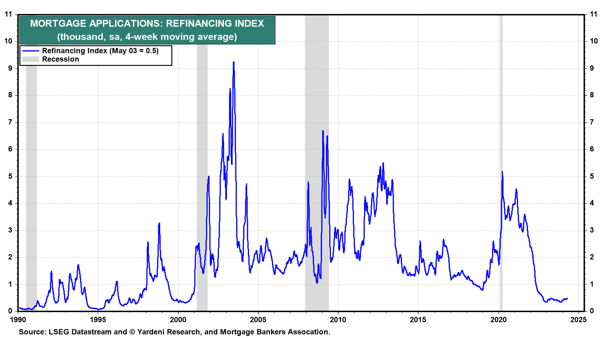 As Melissa and I have observed before, Baby Boom households have a record $76.2 trillion in net worth (Fig. 12 below). They are the richest cohort of seniors ever. According to Census data, of the 86 million households who own their own homes, almost 40% had no mortgage in 2022. Most of them are probably Baby Boomers. And many of those who have mortgages refinanced them at record-low rates during 2020 and 2021 (Fig. 13 below).