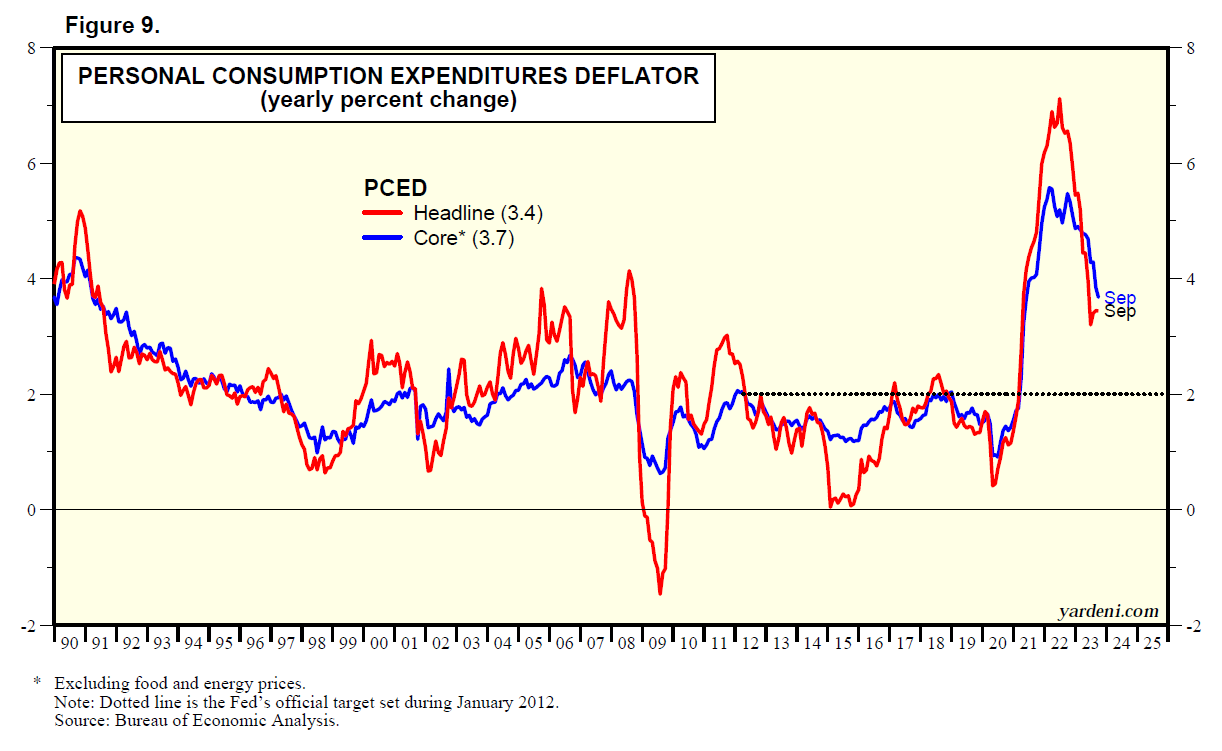 (1/4) We’ve recently observed that the headline and core CPI inflation rates were both 2.0% in September excluding shelter. Of course, the Fed tends to give more weight to the PCED inflation rate. The headline and core inflation rates for this measure of consumer prices were 3.4% and 3.7% during September (Fig. 9 below).