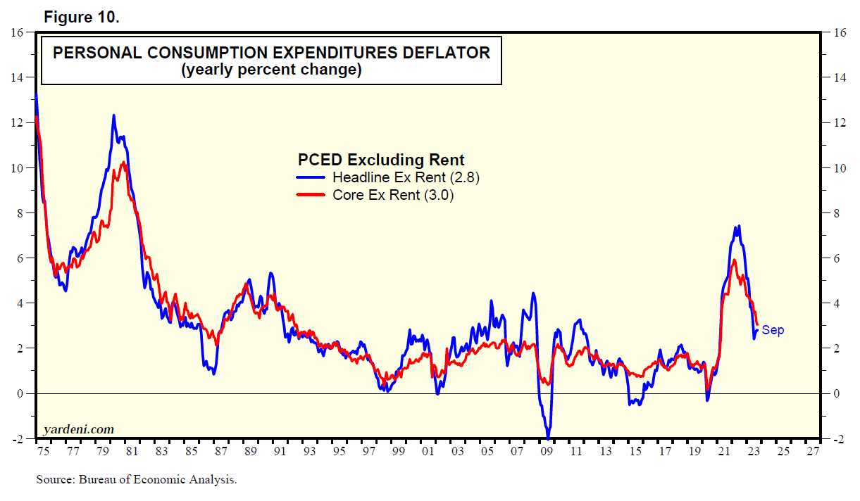 Excluding rent, the headline and core PCED inflation rates were down to 2.8% and 3.0% in September (Fig. 10 below). Both are down sharply from their 2022 peaks of 7.4% and 5.9%.