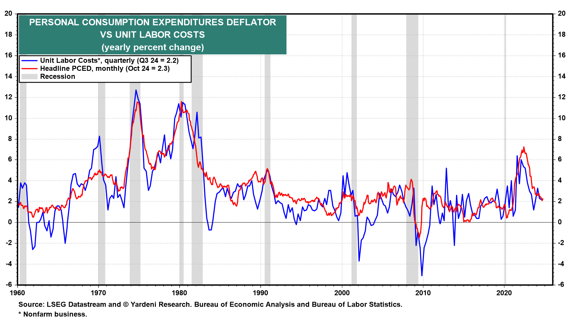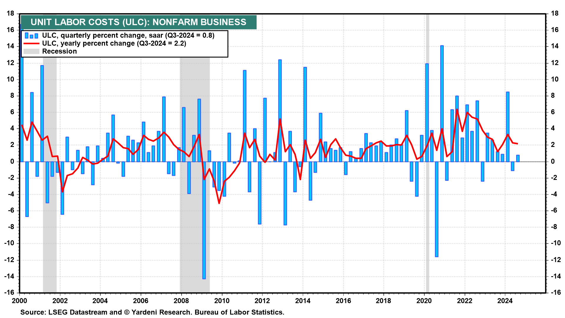 The y/y headline PCED inflation rate closely tracks the y/y ULC inflation rate (Fig. 2 below). The former was up just 2.3% through October, while the latter rose 2.2%. Both are down from over 6.0% in 2022. In other words, the decline in the ULC inflation rate was the major reason that consumer price inflation has moderated since its summer 2022 peak.