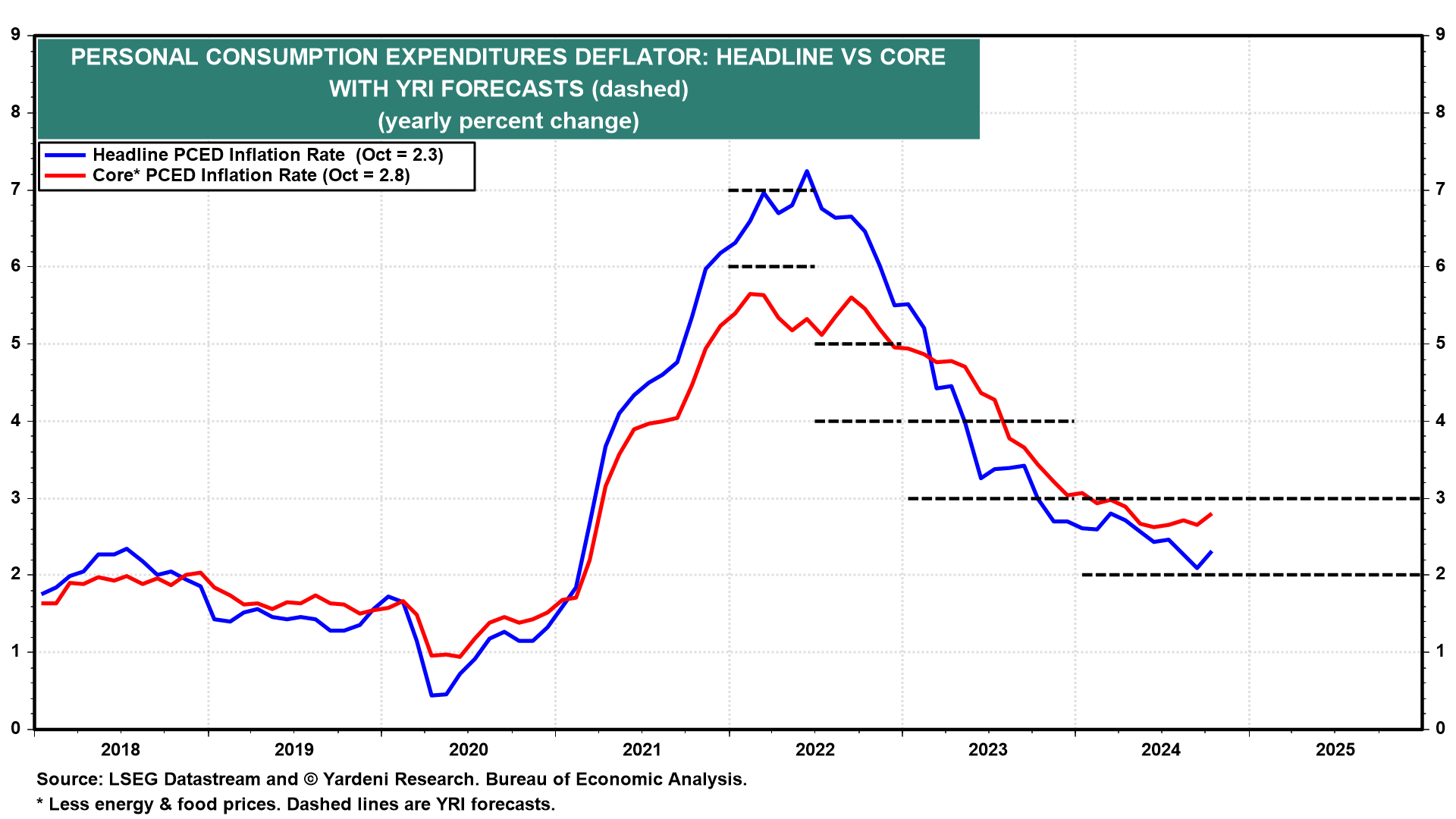 Regarding fiscal policy, Trump 2.0’s impact on inflation is a “known unknown.” Tax cuts would also boost demand for goods and services. Tariffs would likely cause a one-time increase in the inflation rate unless they are offset by a stronger dollar. Deregulation should be mostly disinflationary. Reductions in federal government spending would also be disinflationary, but they aren’t likely to be significant enough to affect inflation much either way. More energy production could help hold down not only energy prices but prices broadly.