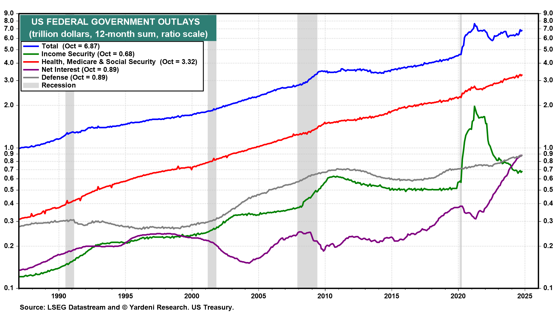 Since the start of 2022 through October of this year, total federal government spending is up $192 billion (using the 12-month sum) to $6.9 trillion (Fig. 1 below). Government spending on Health, Medicare, and Social Security rose $623 billion to a record $3.3 trillion over this period. There was a big drop in government spending on income security by $806 billion to $0.7 trillion, but that was almost completely offset by a $139 billion increase in defense spending to a record $0.9 trillion and, even more significantly, by a $510 billion increase in net interest outlays to a record $0.9 trillion (Fig. 2 below).